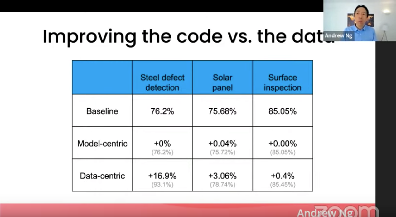 다시 Andrew NG 교수의 이야기로 넘어가 보자. 그는 2021년 3월, ‘머신러닝 시스템 개발: 모델 중심에서 데이터 중심으로(A Chat with Andrew on MLOps: From Model-centric to Data-centric AI)'라는 세미나에서 그동안 모델 연구에 치우쳐 있던 인공지능 분야에 ‘데이터 중심(Data-centric) AI’라는 새로운 화두를 던졌다. 그의 세미나는 알고리즘 연구에 치우쳐졌던 기존의 인공지능 분야에 데이터의 중요성을 부각한 중요한 계기가 되었다.