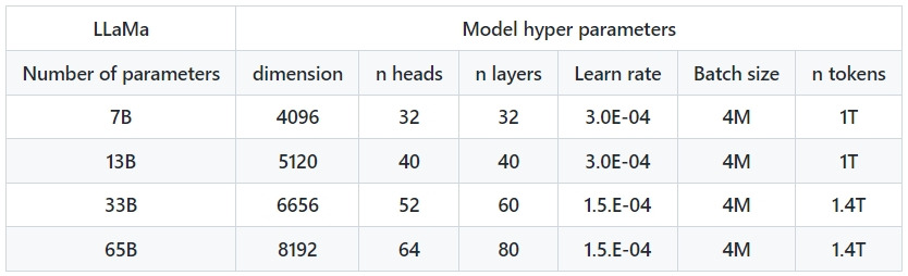 Meta의 LLaMA는 70억, 130억, 330억, 650억 개의 매개변수를 가지는 네 가지 모델로 구성되어 있습니다. 이 모델들은 1750억 개의 매개변수를 가진 GPT-3.5와 비교했을 때 매개변수 수가 적지만 그럼에도 불구하고 준수한 성능과 모델 학습의 유연성을 자랑하며 개발자들 사이에서 인기를 끌고 있습니다.