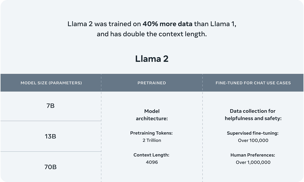 메타는 2023년 7월에 LLaMA2를 선보였습니다. LLaMA2는 사전 학습 말뭉치(pre-training corpus)가 1조 4천억 개에서 2조 개로, 약 40% 증가하며 모델의 학습 데이터 범위가 크게 확장되었습니다. 매개변수도 기존의 네 가지에서 70억 개, 130억 개, 700억 개 세 개의 모델로 통합되었습니다.