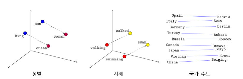 단어 자체의 관계를 나타내는 단어 임베딩의 예시