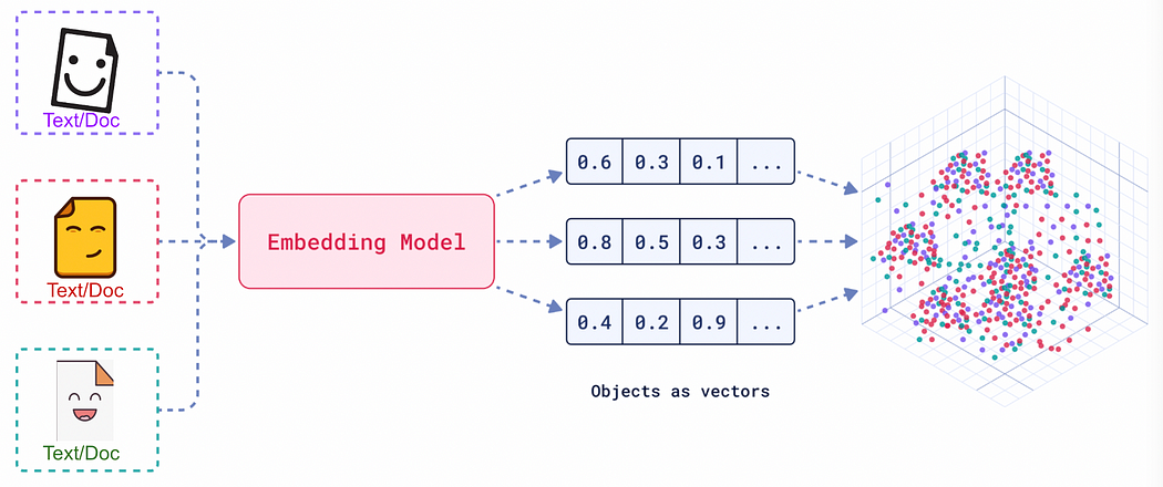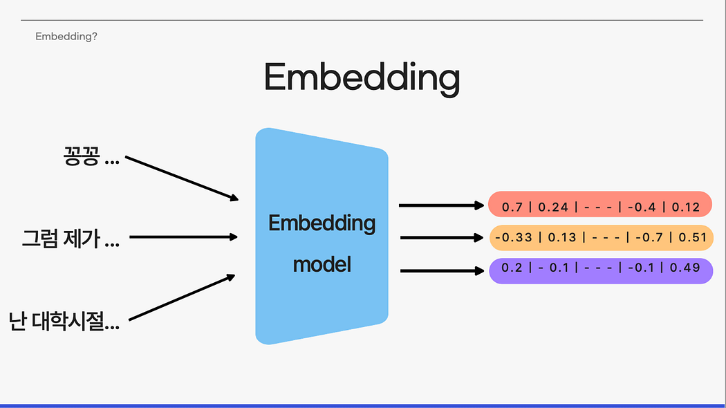 텍스트 데이터를 다차원 벡터로 변환해 주는 임베딩 모델 (출처 : medium)