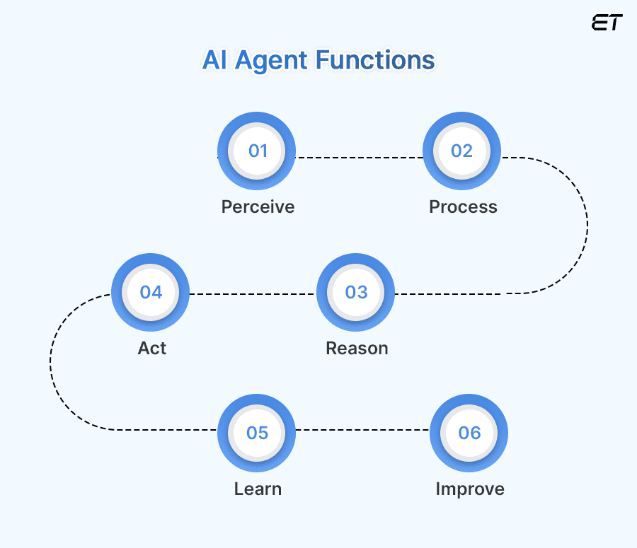또한 AI 에이전트를 정의하기 위해서는 그 기능을 구성하는 요소들을 명확히 정의해야 할 필요가 있습니다. AI 에이전트는 단순히 특정 명령을 수행하는 시스템을 넘어서, 환경을 인식하고(Perceive), 데이터를 처리(Process)하고 이를 기반으로 학습하며(Learn), 적절한 결정을 내리고(Reason) 이를 바탕으로 행동(Act)할 수 있는 복합적인 시스템입니다.