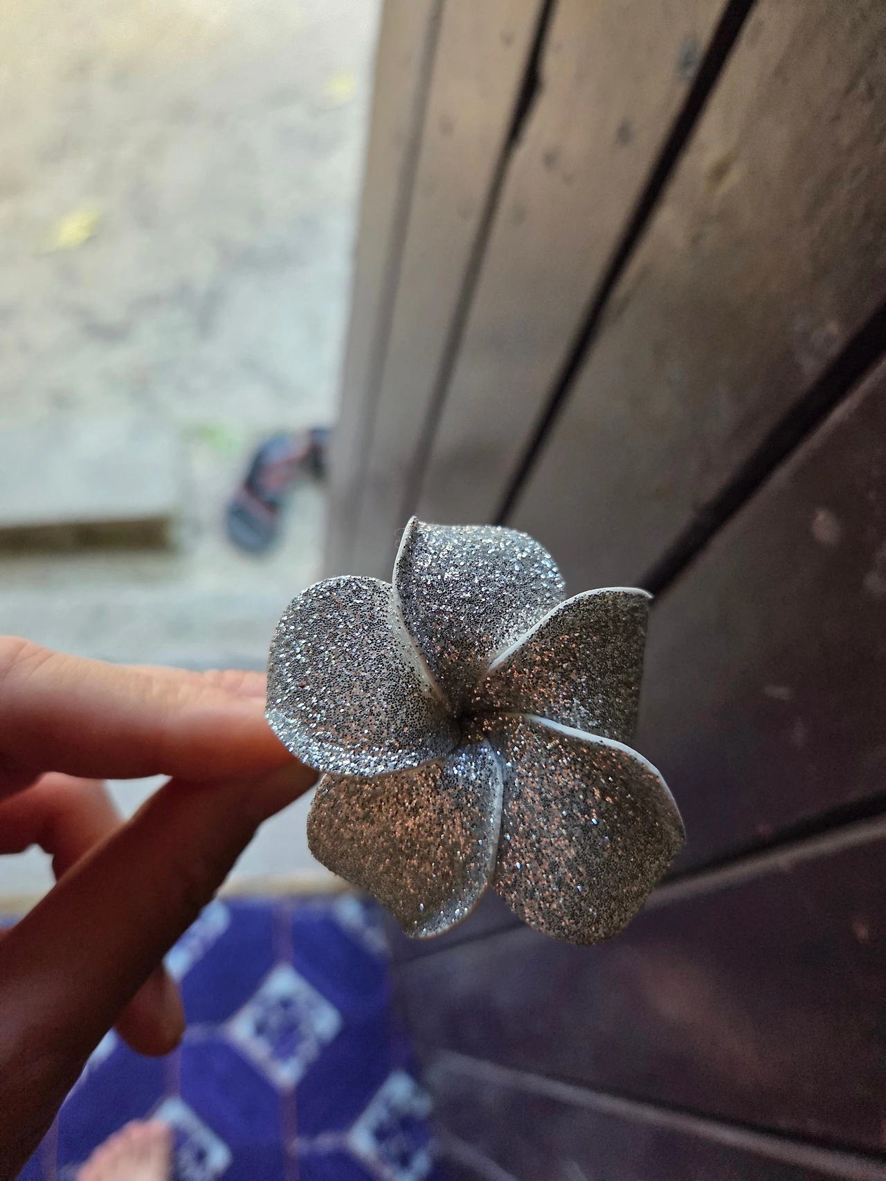 내가 그녀에게 머리에 꽂은 꽃핀이 예쁘다고 말하자 그녀는 작은 가방에서 은색으로 반짝반짝 빛나는 꽃핀을 선물로 주었다.