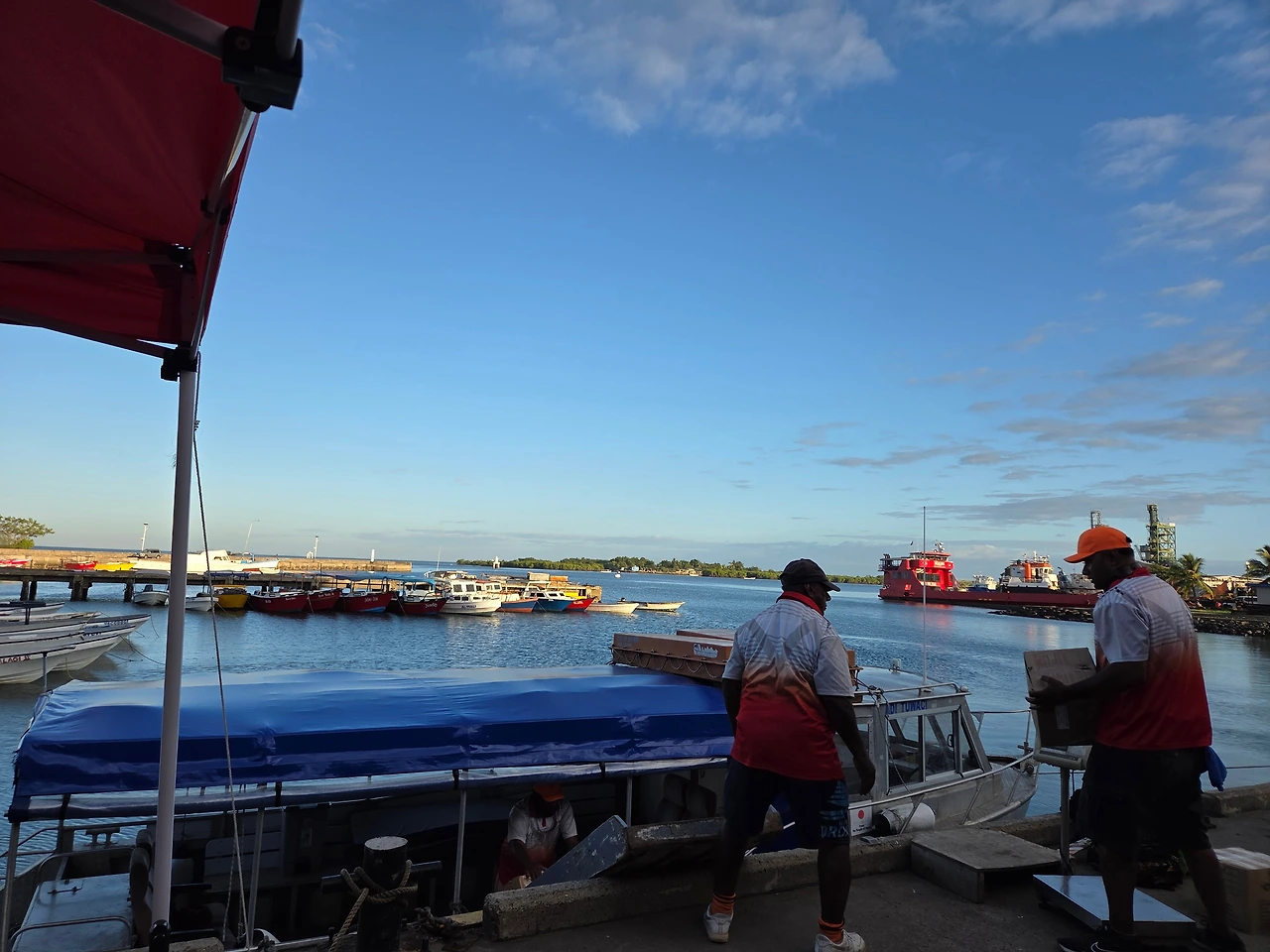 현지인들이 테이프로 칭칭 두른 박스와 꾸러미들을 작은 배 안으로 직원들과 함께 나르고 아이 두 명은 시끄럽게 떠들며 돌아다니고 있었다.