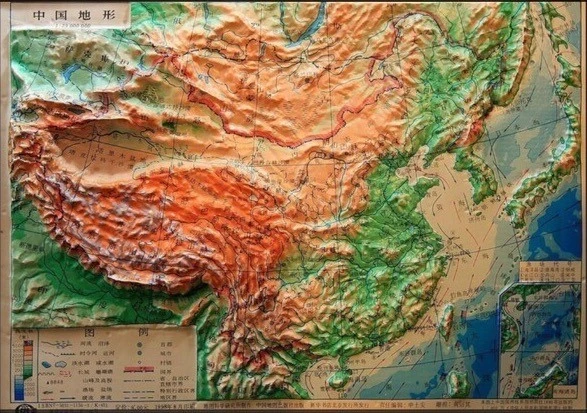 중국 지형도, 가운데 아래 산으로 둘러싸인 분지가 쓰촨이다.