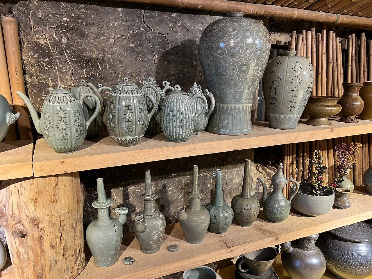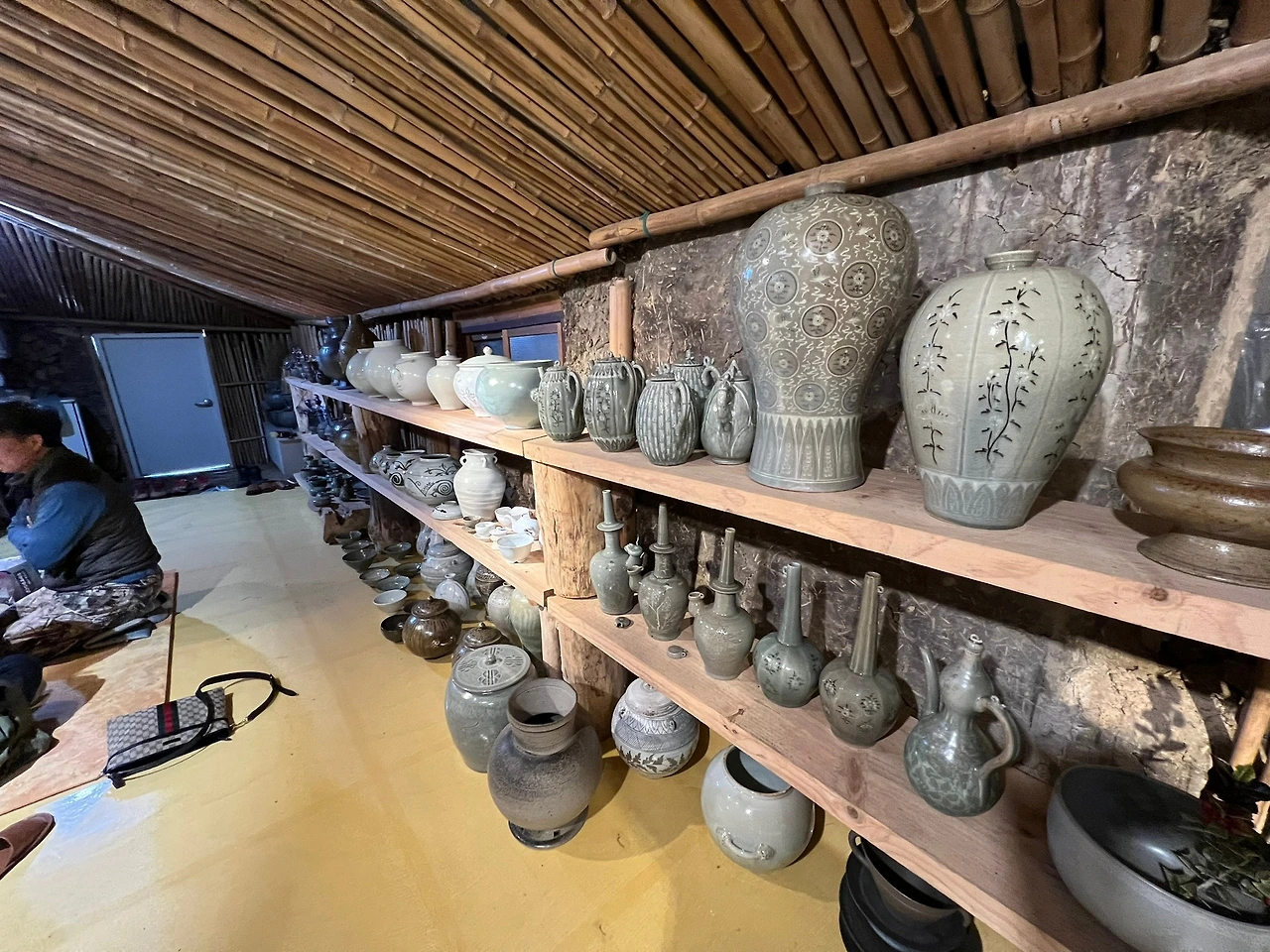 우와, 소리가 절로 나오는 광경이었다. 전시실은 ㄷ자 모양으로 선반을 둘렀는데, 온갖 모양의 도자기들이 가득했고, 바닥에 모아놓은 작품도 꽤 많았다. 일단 도자기 문외한의 눈에는 신라토기 중 국보로 유명한 기마인물상이 보였고, 달항아리를 비롯한 약간의 백자 작품들 외에는 거의 청자 계열의 작품들로 보였다. 거기에는 예전 미술책에서나 보았던 청자 매병이며, 주병, 사발, 상형청자 등이 다양하게 진열되어 있었다. 허름한 슬레이트 지붕집 안에 너무 자연스럽게 늘어선 도자기를 보는 것이 약간 비현실적인 느낌을 주었다.