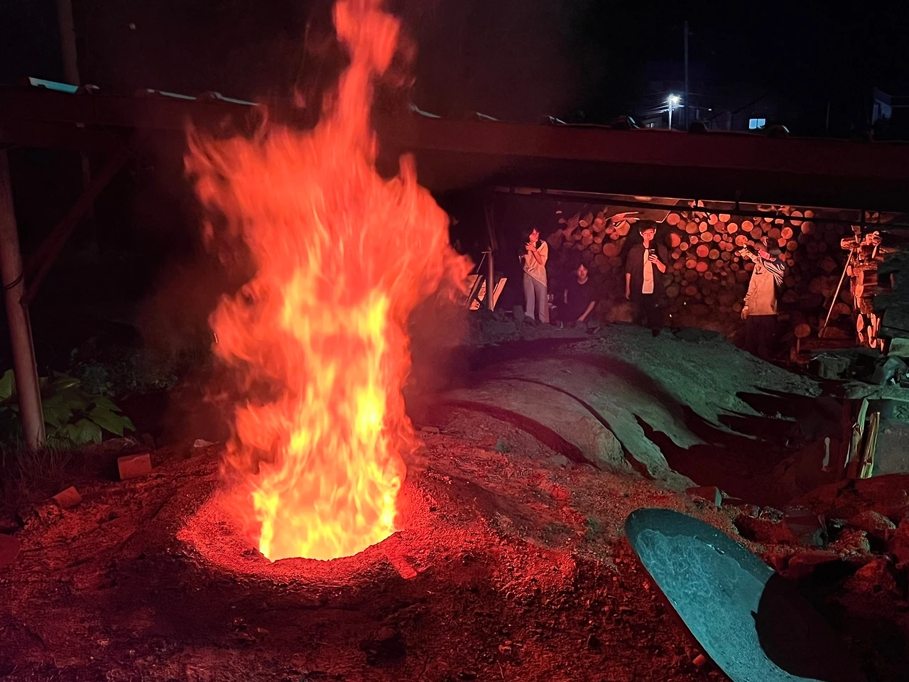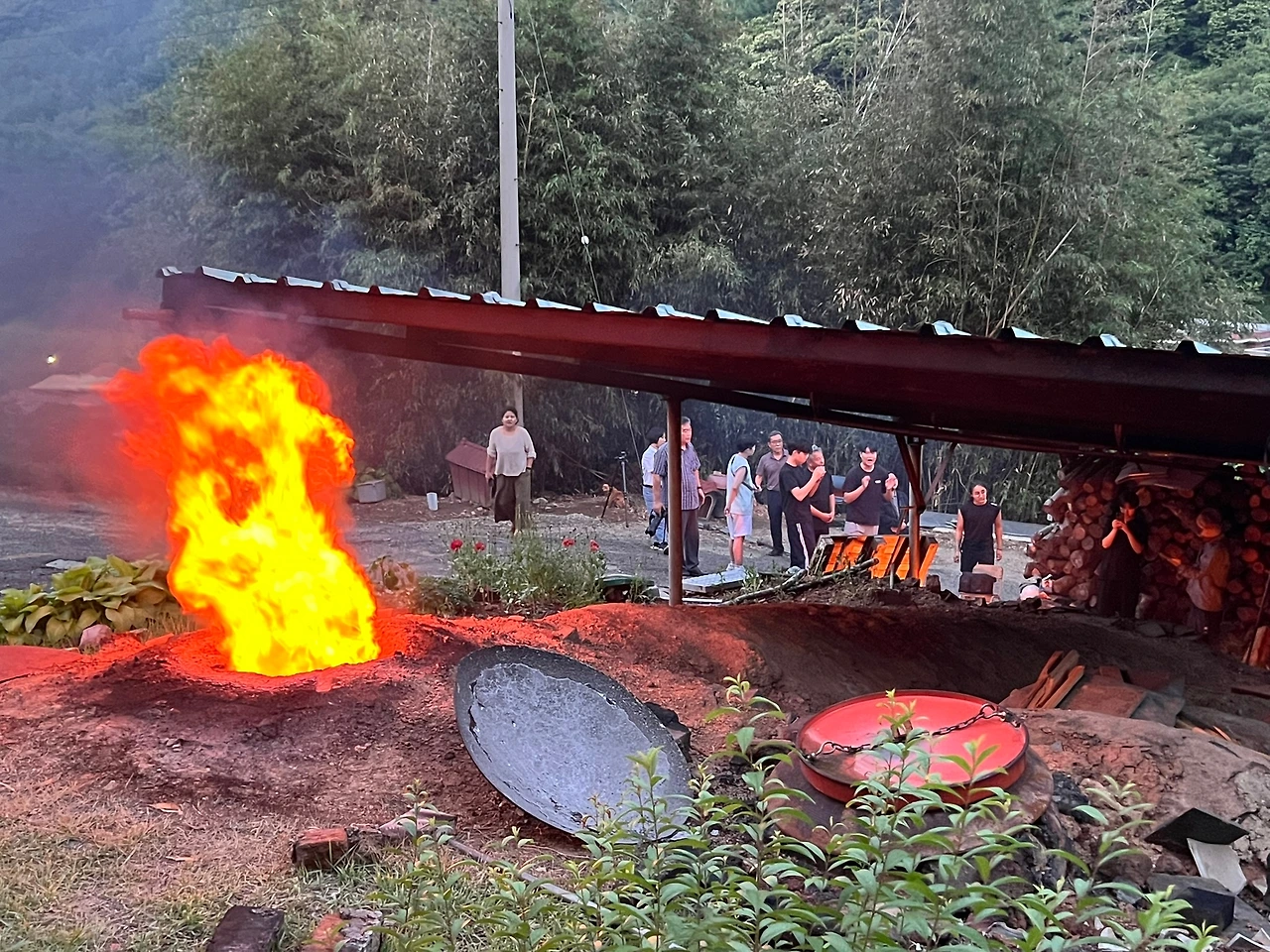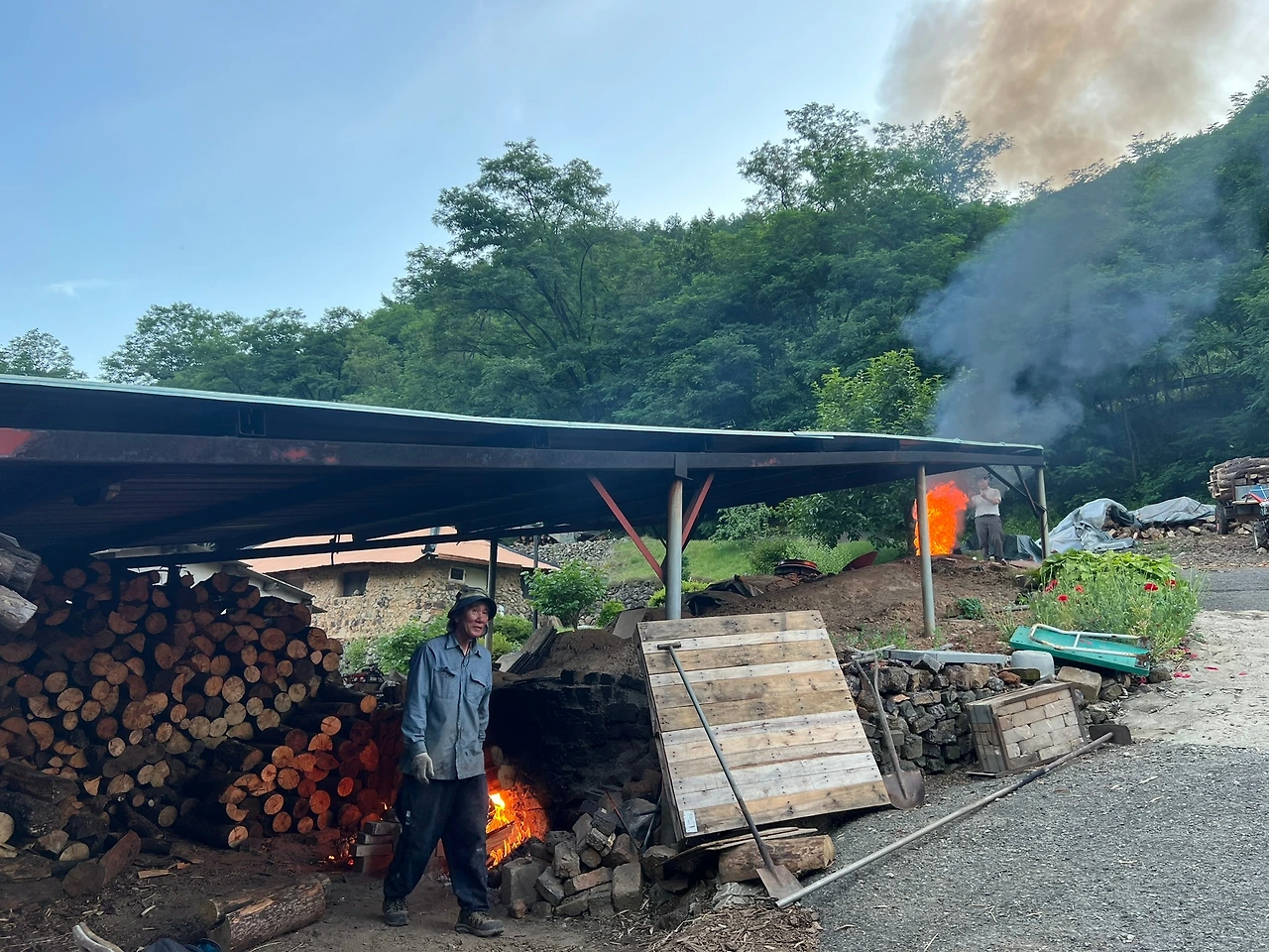 마지막 (올림) 불을 넣는 장면은 장관이었다. 오후에 가서 초저녁까지 불구경을 했다. 통가마의 한쪽 끝은 큼직한 장작들을 얽어놓고 불을 넣고 있었는데, 반대편 끝에 있는 굴뚝 역할을 하는 구멍으로는 푸른색을 띠는 투명한 불꽃이 기세 좋게 올라오고 있었다. 이 날은 미리 초대받은 손님들이 와서 불이 올라오는 것을 참관했다. 멀리 어느 대안학교에서는 승합차로 한 무리의 학생들을 데리고 와서 이 행사에 참석했다. 해겸선생과 학생들이 서로 맞절을 하는 모습도 볼 수 있었다. 특별한 인연이 있어서 일 년에 한 번 이렇게 다녀간다고 했다.