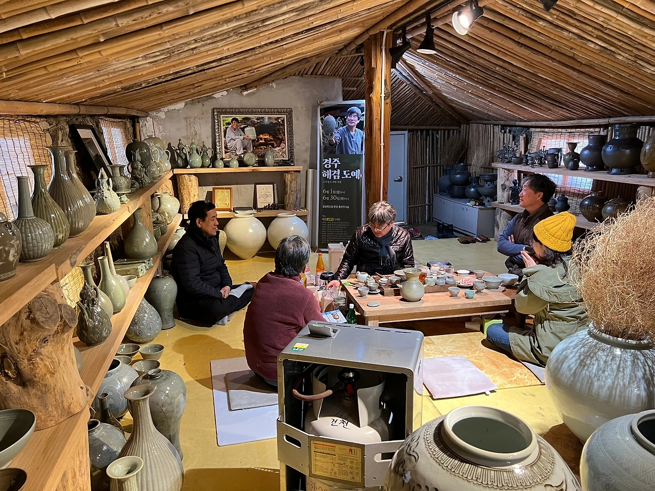 그 말을 휘감아 도는 중량감을 실감한 것은 2024년 봄 단석산 아래 ‘해겸도요’를 방문하면서였다. 도자기 평론을 하시는 이용범 선생(성함이 드래곤+타이거라서 앞으로는 DT 선생으로 부르겠다.)과 몇 분이 함께 방문하는 길에 어쩌다가 끼게 되었다. 경주 시내에서 차로 30분 정도 거리다. 신라시대에 김유신이 여기서 검을 수련했다는 전설이 서린 단석산(800m) 아래를 지나 산내지역으로 가는 길에서 도로 아래로 살짝 난 진입로를 따라 내려오면 ‘해겸도요’가 있었다. 장작을 때는 흙가마가 두 줄 있었고, 그 옆에 작업실과 그간 만든 작품들을 모아놓은 전시실 역할을 하는 방이 하나 있었다. 우리는 처마가 낮은 그 방으로 안내를 받아 들어갔다.