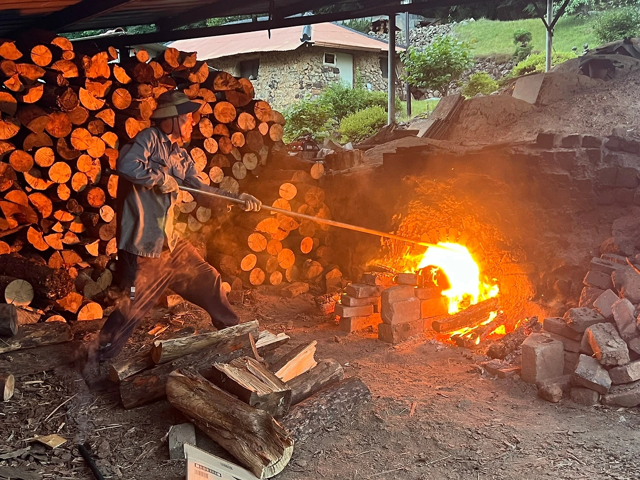 해겸도요를 두 번째 방문한 것은 봄 시즌 가마작업의 마지막 불을 넣는 날이었다. 이곳이 다른 도요와 크게 다른 점은 10m쯤 되는 일자형 통가마에 장작으로 21일간 불을 땐다는 점이다. 지금 대부분의 도자기요에서는 전기 가마나 가스 가마를 사용하고, 그것도 하루나 이틀 정도 불을 넣는 것에 비교하면 엄청난 시간과 비용이 투입되는 작업 방식이다. 3주간 불을 유지해 오다가, 마지막 날에는 불을 최고도로 높인 다음 가마를 봉하고 식을 때까지 다시 3주를 기다린다고 하니 한번 불을 넣으면 6주는 되어야 작품을 꺼낼 수 있다. 작업 방식이 이렇다 보니 현재는 봄에 한 번, 가을에 한 번 불을 올린다.