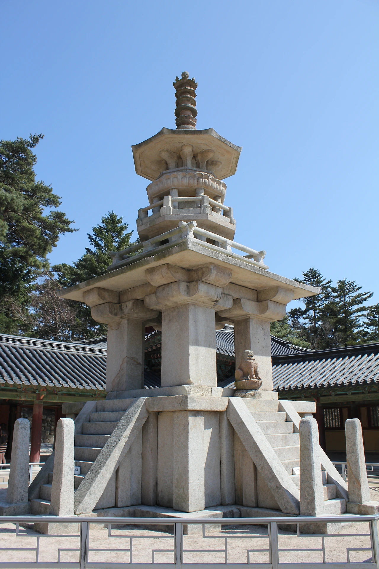 셋째 포인트는 대웅전 마당이다. 그 유명한 두 개의 탑, 다보탑과 석가탑이 여기에 마주 보고 서있다. 이 둘 역시 국보이다. 원래 석가모니는 죽기 전에 자신의 모습을 본딴 상을 만들지 말도록 신신당부했다고 한다. 그래서 남은 것이 그의 진신사리와 이를 모신 탑이었다. 불교의 탑은 석가모니의 무덤이자 몸 자체였기에 초기 불교에는 탑이 신앙생활의 중심을 차지하는 대표적 상징물이었다. 이것이 기원 전후 무렵 불상이 만들어지기 시작하면서 불상을 모신 법당이 점차 사찰 구조의 중심을 차지하게 되었다고 한다.