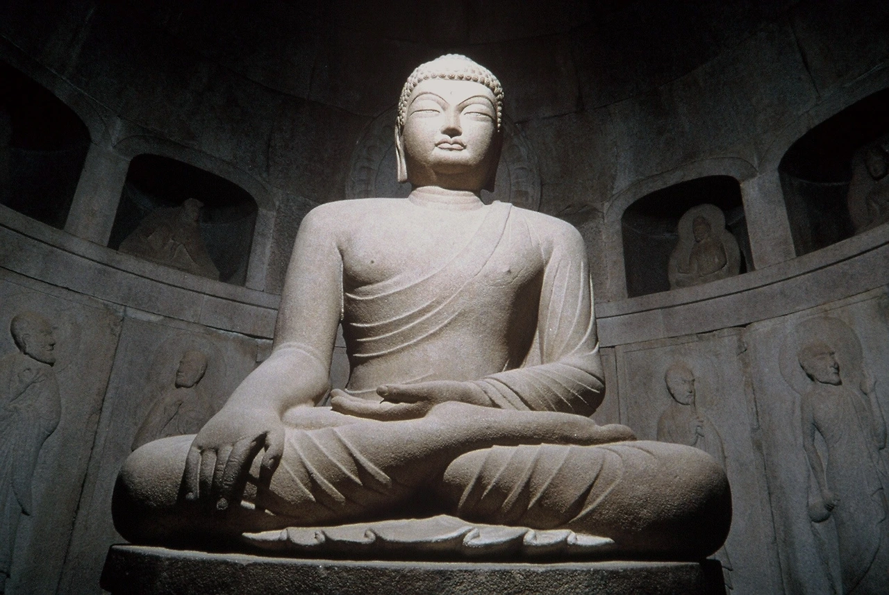 주실로 들어가면 약 2.5m 높이의 부조상들이 본존불을 둘러싸고 있다. 가장 복도 쪽 가까이에 양쪽 편으로 나누어 서 있는 존재가 보현보살, 문수보살, 제석천, 범천이다. 그다음에 석가모니의 10대 제자들이 있고, 본존불 바로 뒤편에는 십일면관음보살이 있다. 정작 석굴암에 가서는 주실의 이 불상들을 볼 수가 없는데, 경주박물관에서 이 부조상의 일부를 재현품으로 감상할 수 있다. 매우 정교하고, 세련된 조각으로 정평이 있고, 몸의 비례가 매우 유려하다는 것을 알 수 있다. 전실의 신장 상들과 조각의 미감이 차이가 느껴질 정도라서 서로 조성된 시대가 다른 것이 아니냐는 평가도 나온다. 본존불은 제자들로 둘러싸인 것으로 보아 석가여래일 것으로 추정한다. 한국의 불상 중 최고의 작품일 것이다. 우리가 생각하는 석가여래의 원형이자 이상형은 압도적으로 이 본존불에 근거하고 있을 것이다. 불교 전래 후기로 갈수록 중국이나 인도 풍을 추종하는 스타일이 많이 나오고, 완성도가 오히려 떨어지는 경우가 생기는데, 석굴암 본존불은 경주 일대에서 다양하게 볼 수 있는 초기의 투박한 얼굴형, 3등신에 가까운 몸통의 비례 등에서 발전해 나온 자생적 불상의 전통이 비례나 스타일 면에서 흠잡을 곳 없는 수준에 도달한 완성도를 보여주고 있다고 평할 만하다. (이 흥미로운 발전과정은 경주박물관의 신라미술관과 경주 남산에 산재한 여러 석불들 속에서 잘 살펴볼 수 있다.)