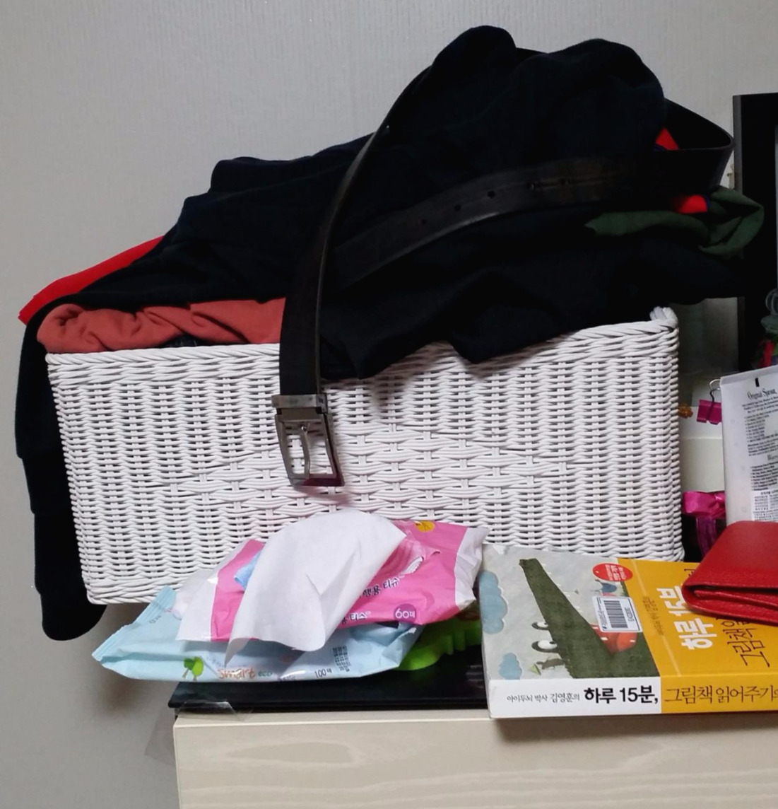 미관상 정말 보기 좋지 않지만, 피곤하다는 핑계로 늘 정리하는 걸 차일피일 미뤄왔다. 남편 물건이니까 남편이 치워야지, 라는 마음으로. 그러나 정작 남편 눈에는 저 광경이 그다지 거슬리지 않기 때문에 문제의 바구니는 항상 저렇게 엉망인 상태로 옷방 입구를 답답하게 막고 있었다.