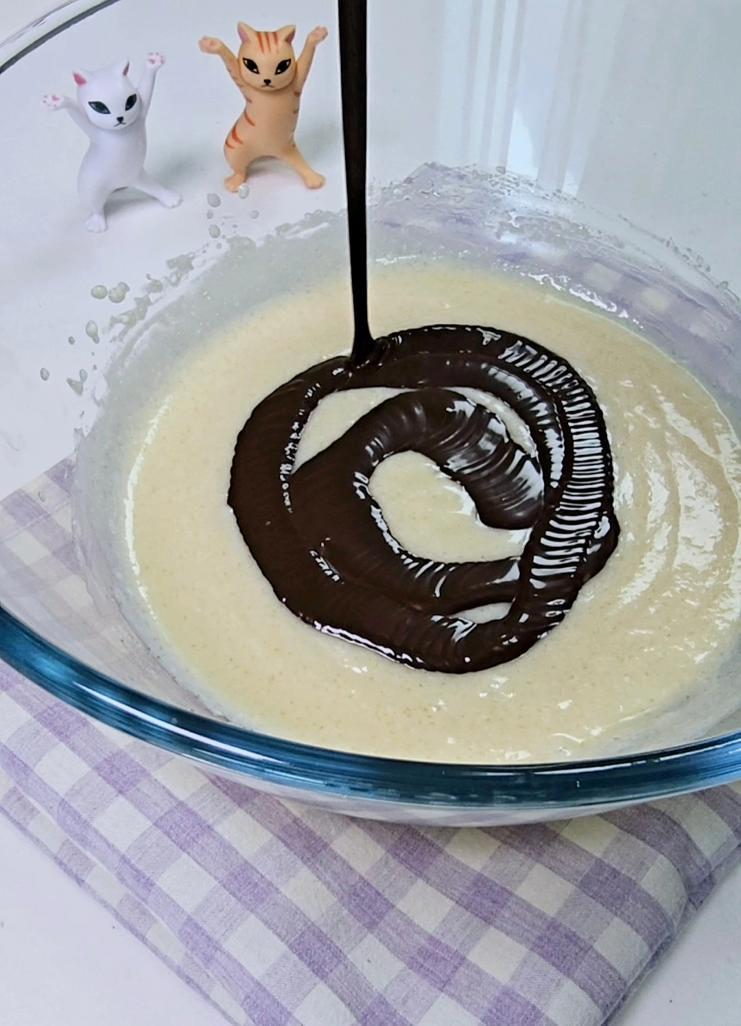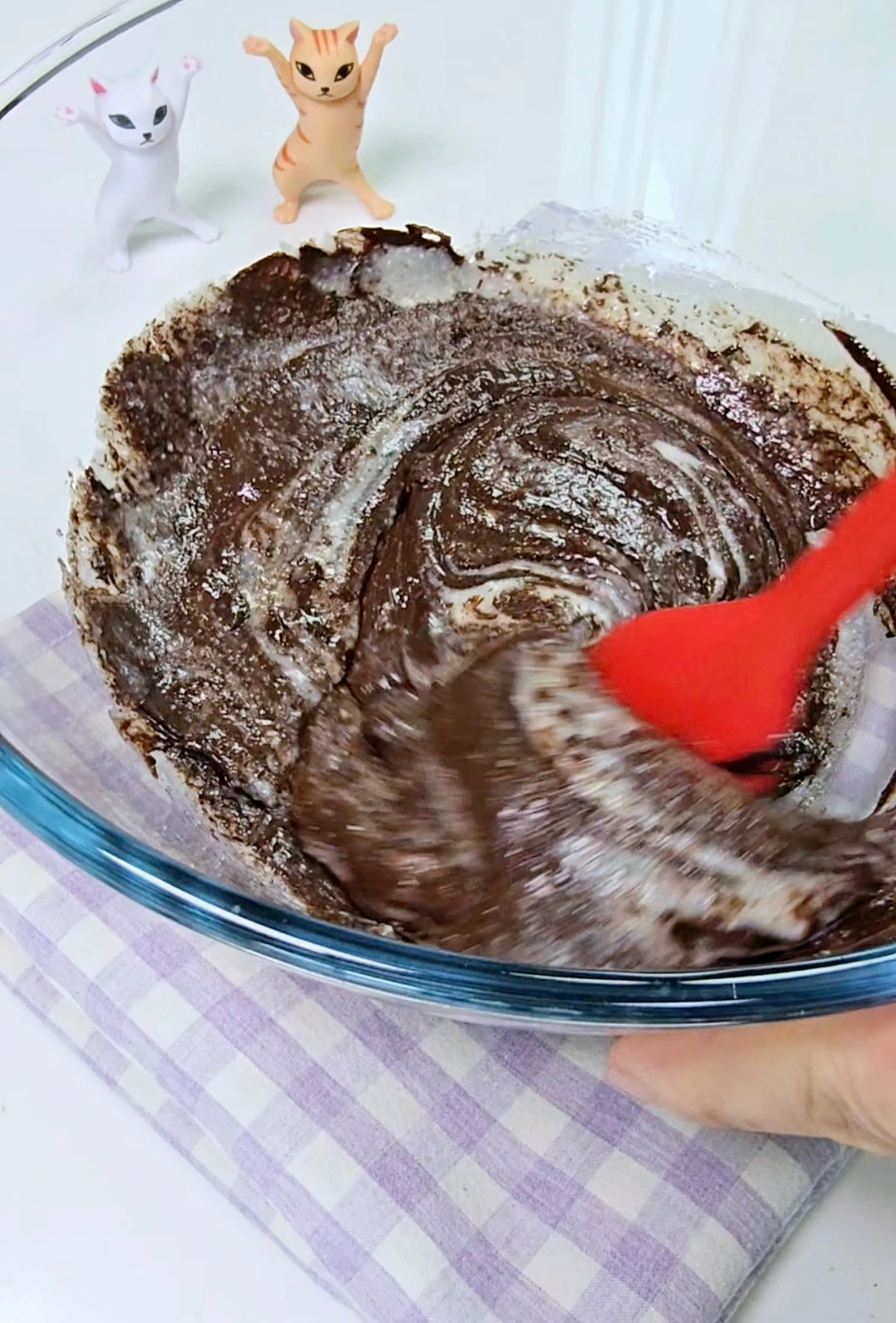 액상 재료를 섞은 볼에 중탕한 초콜릿을 넣어주세요.