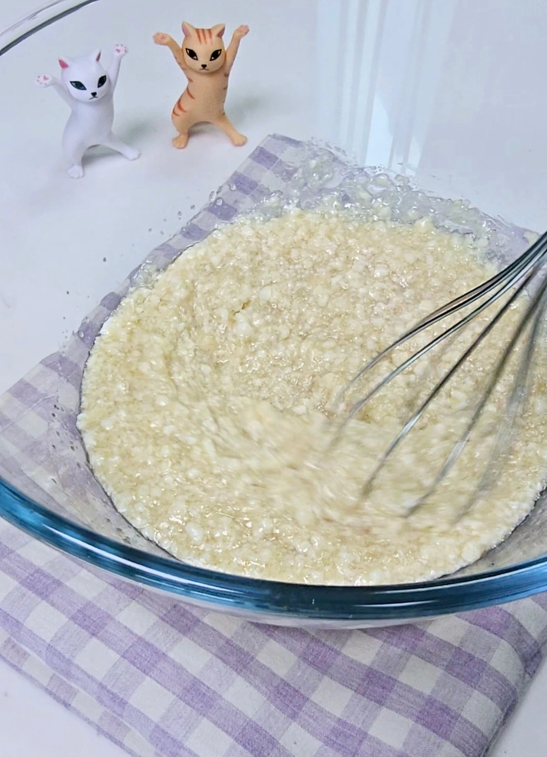 거품기를 사용하여 모래알 같은 비정제원당의 거끌거림이 없어질 정도로 섞어주세요.