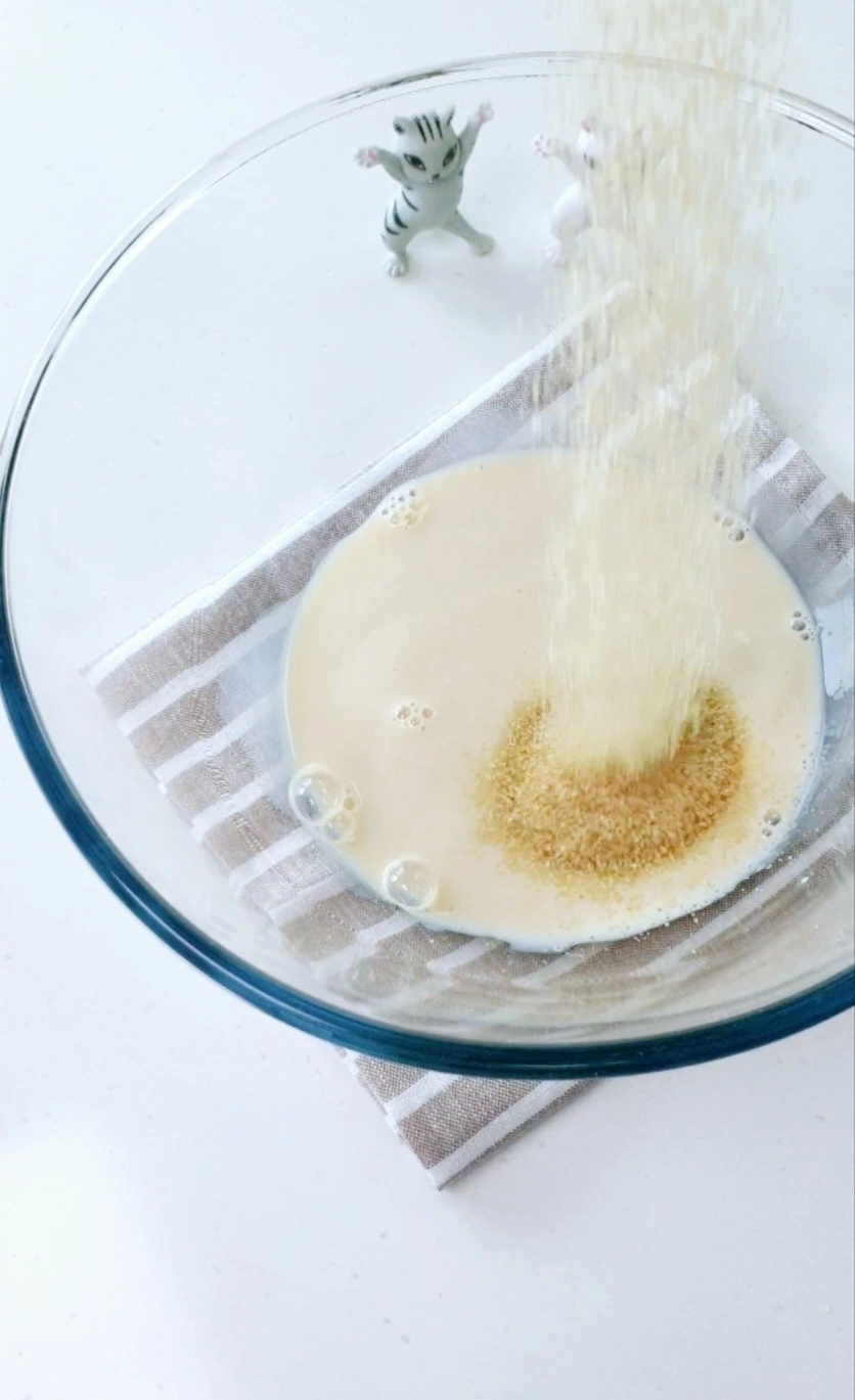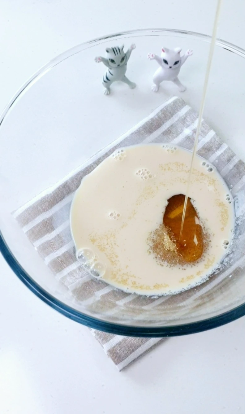 모든 재료를 준비하고 볼에 두유, 원당, 아가베시럽(대체: 메이플시럽)을 넣어주세요.