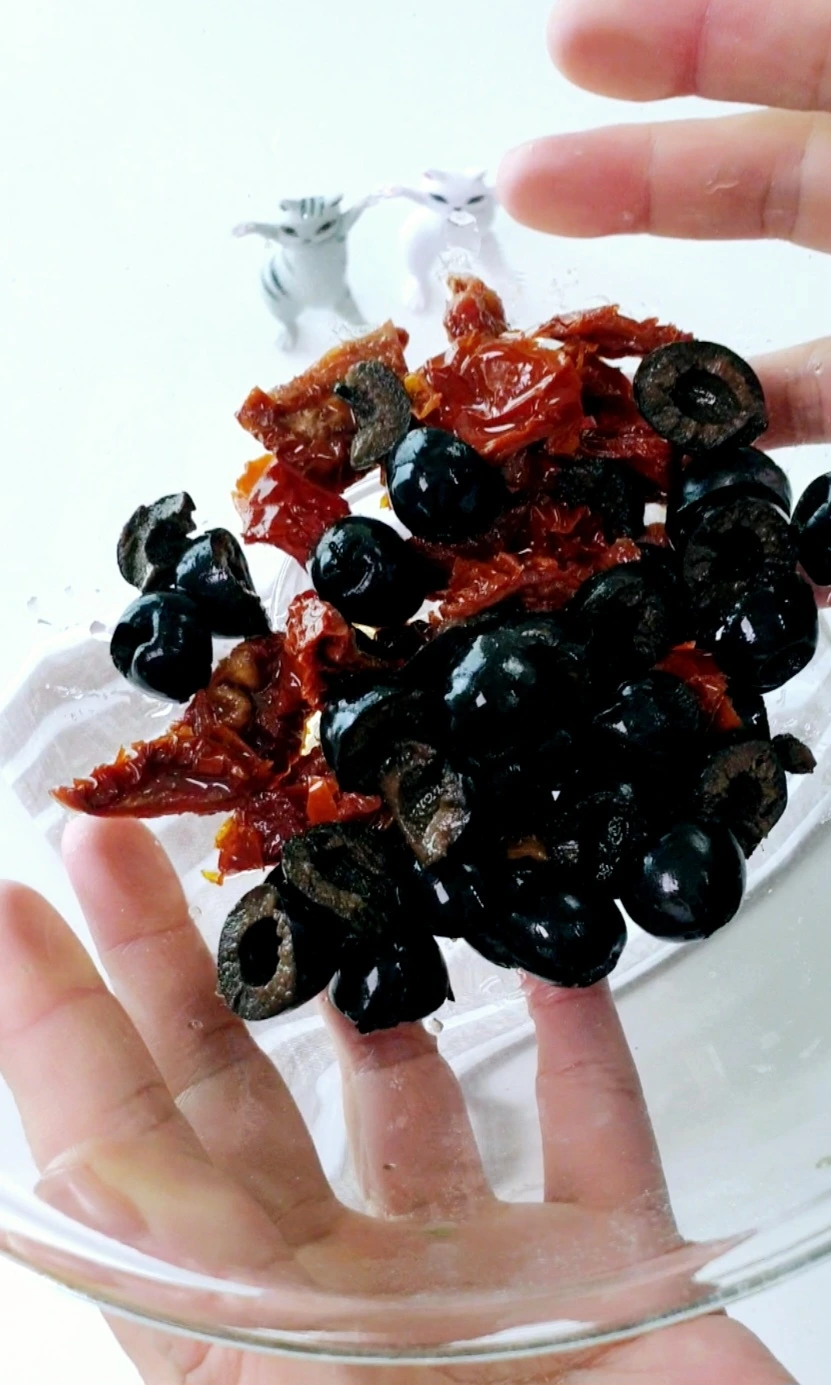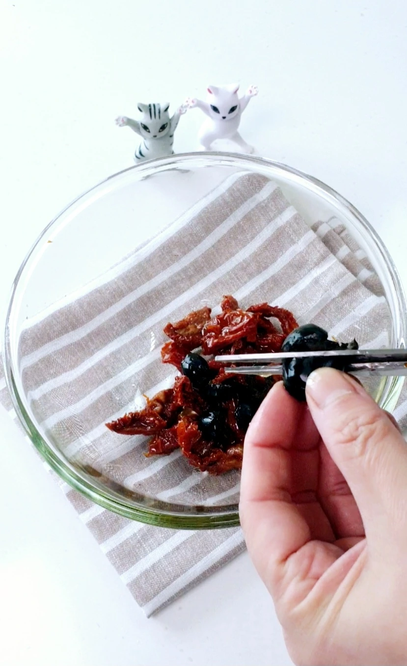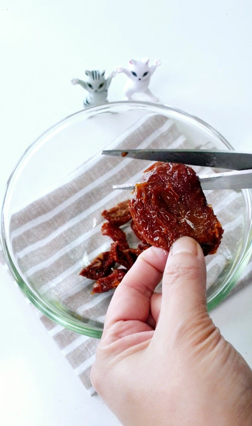 썬드라이 토마토를 먹기 좋은 크기로 잘라주세요.
