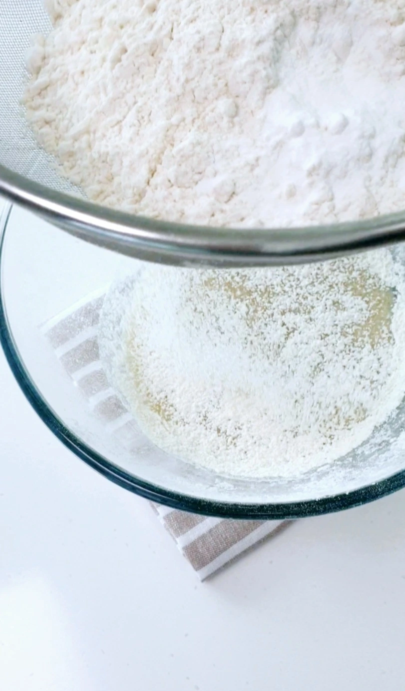 잘 섞은 액상 재료에 체에 쳐서 가루 재료를 넣어주세요.