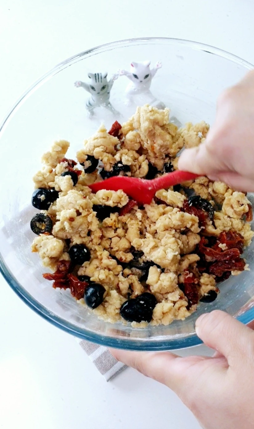 자른 토마토와 올리브를 반죽에 넣고 잘 섞어주세요.