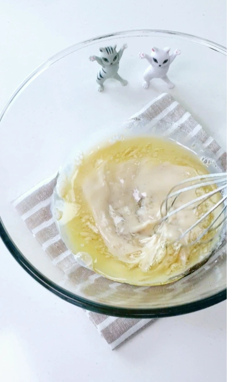 유채유를 넣은 후 거품기로 잘 섞어주세요.