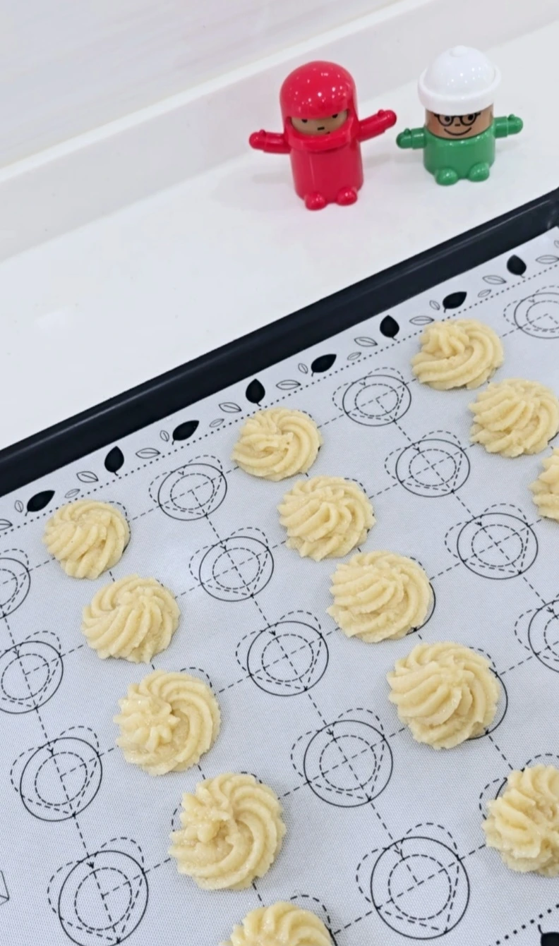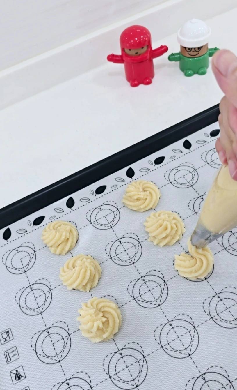 반죽을 짤주머니에 넣고 별 모양 깍지를 끼운 뒤 팬에 모양 만든다.