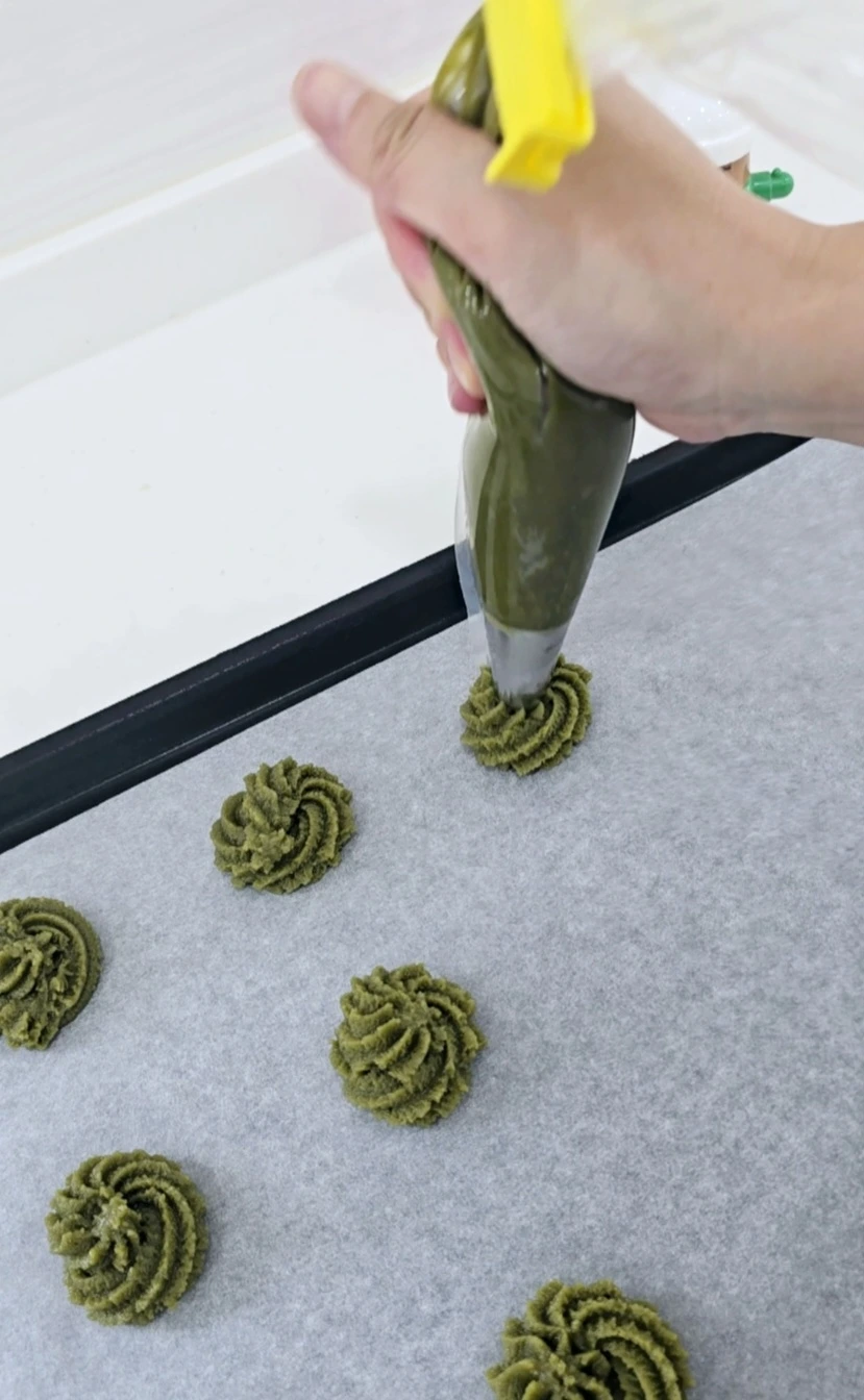 쿠키의 표면은 부드럽고, 손으로 만졌을 때 느껴지는 미세한 거칠기가 말차의 존재감을 더욱 강조한다.