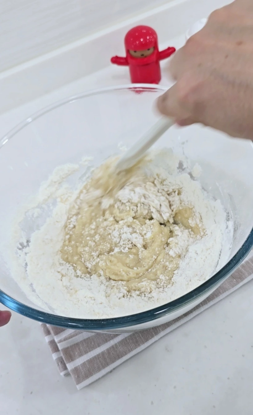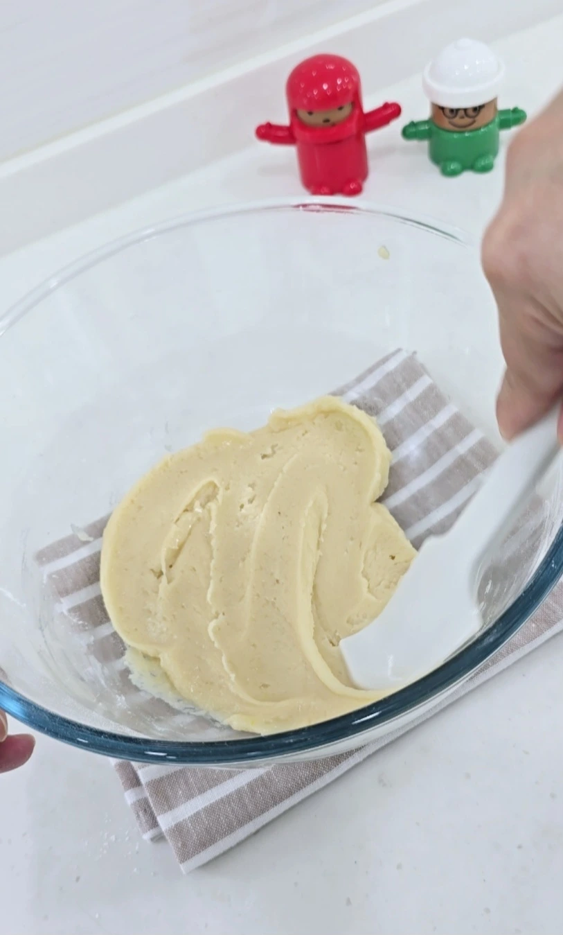 가루 재료와 액상 재료를 주걱으로 가볍게 섞는다.