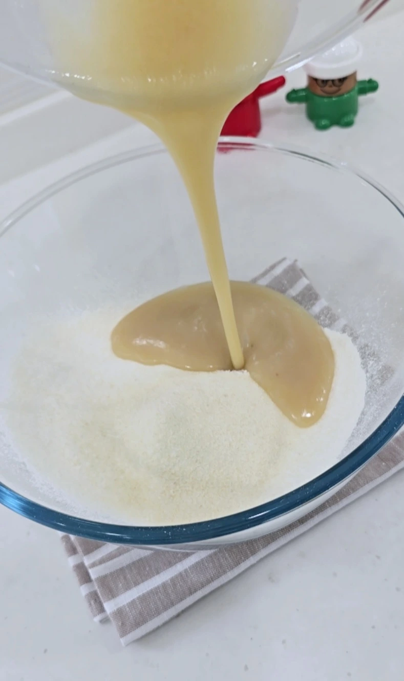 거품기로 섞은 후 가루재료에 넣는다.