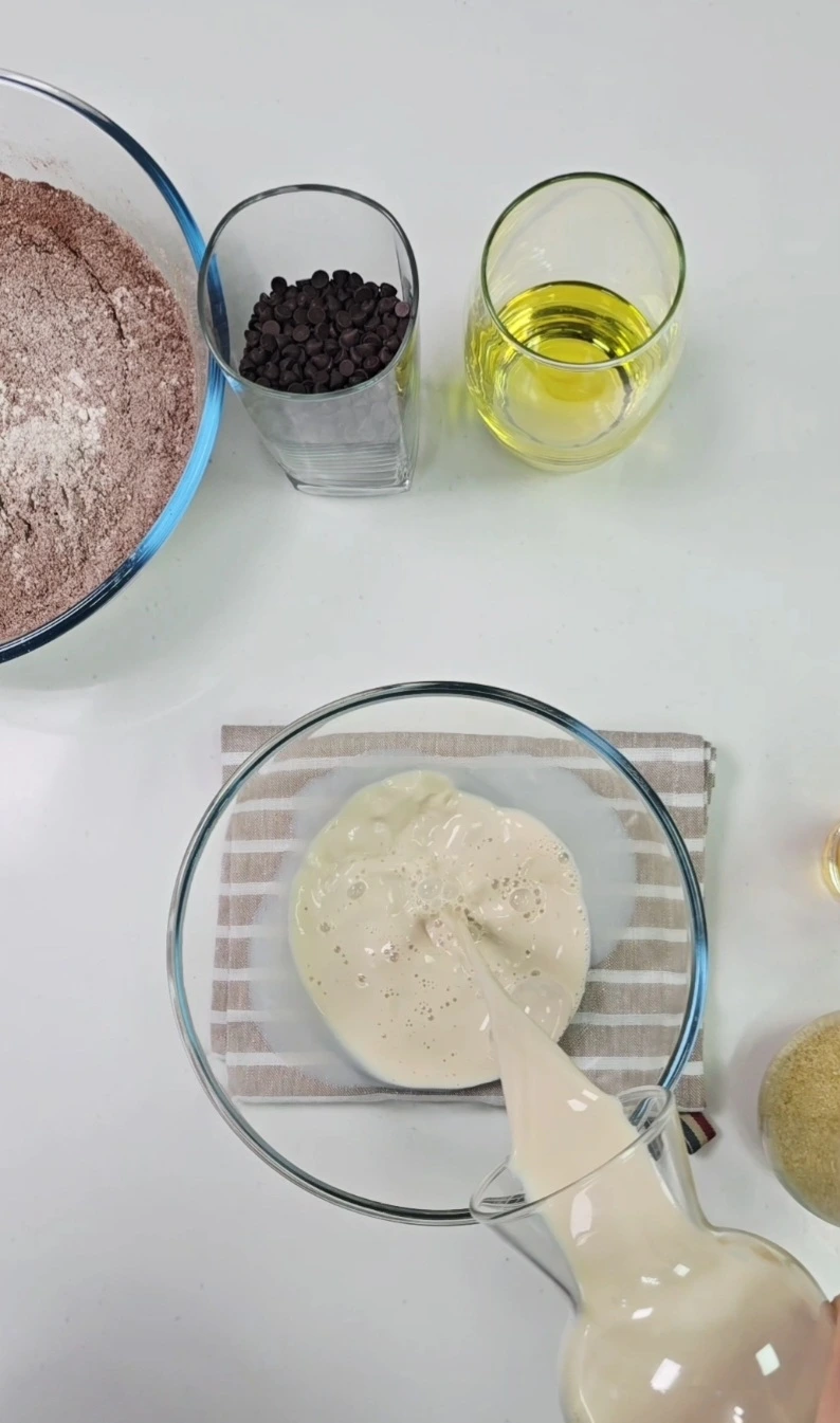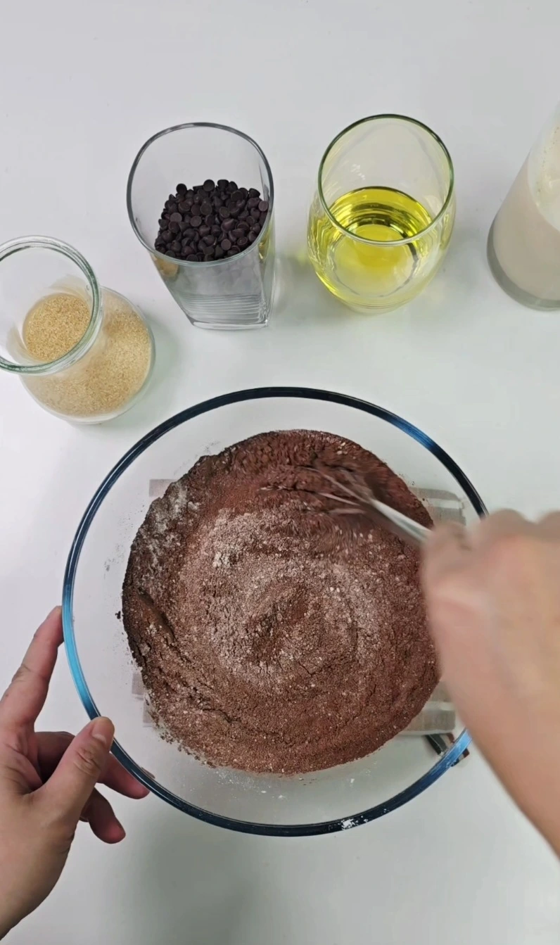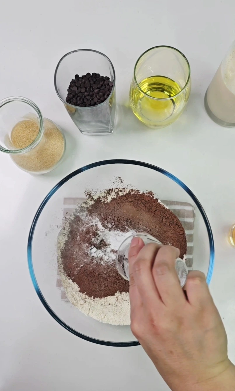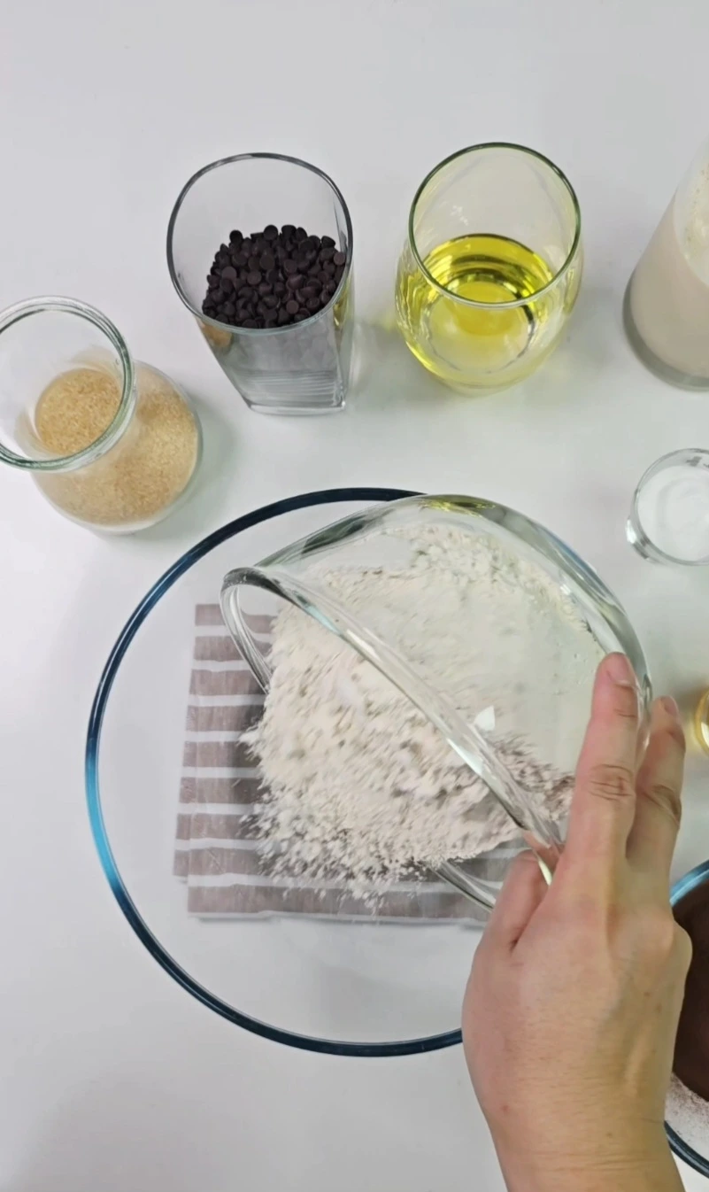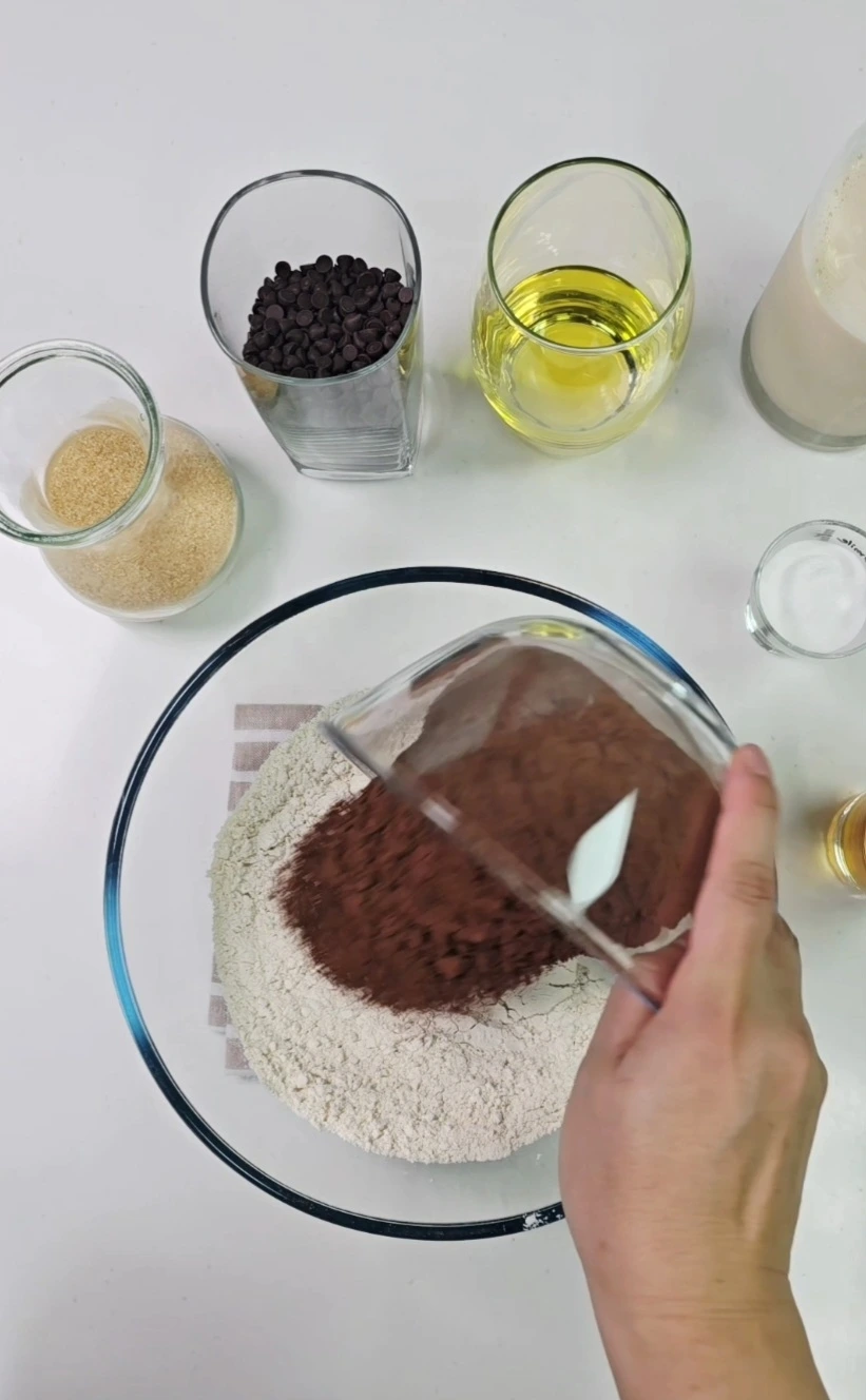 볼에 통밀가루, 초코파우더를 넣습니다.