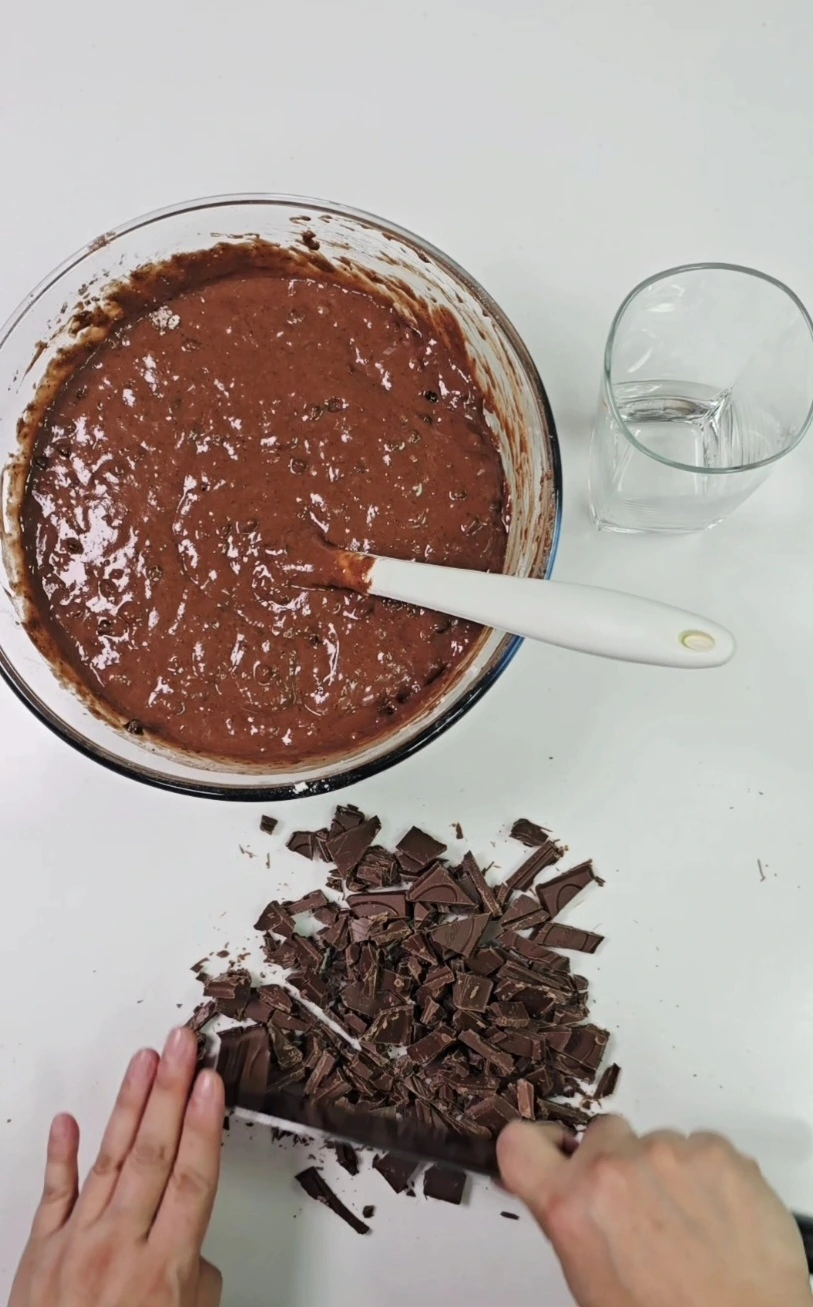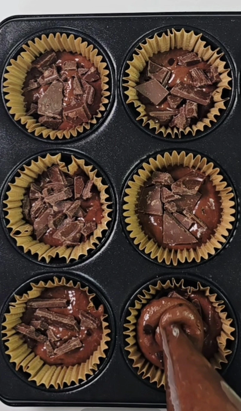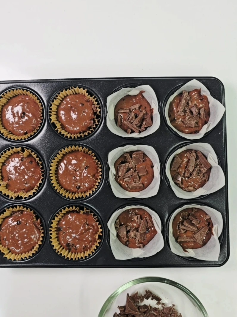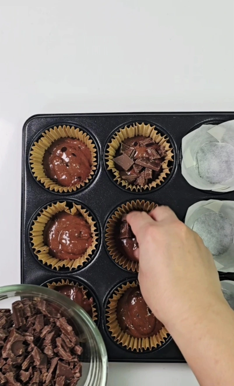 토핑용 초콜릿을 중간에 넣고, 그 뒤를 반죽으로 덮습니다.
