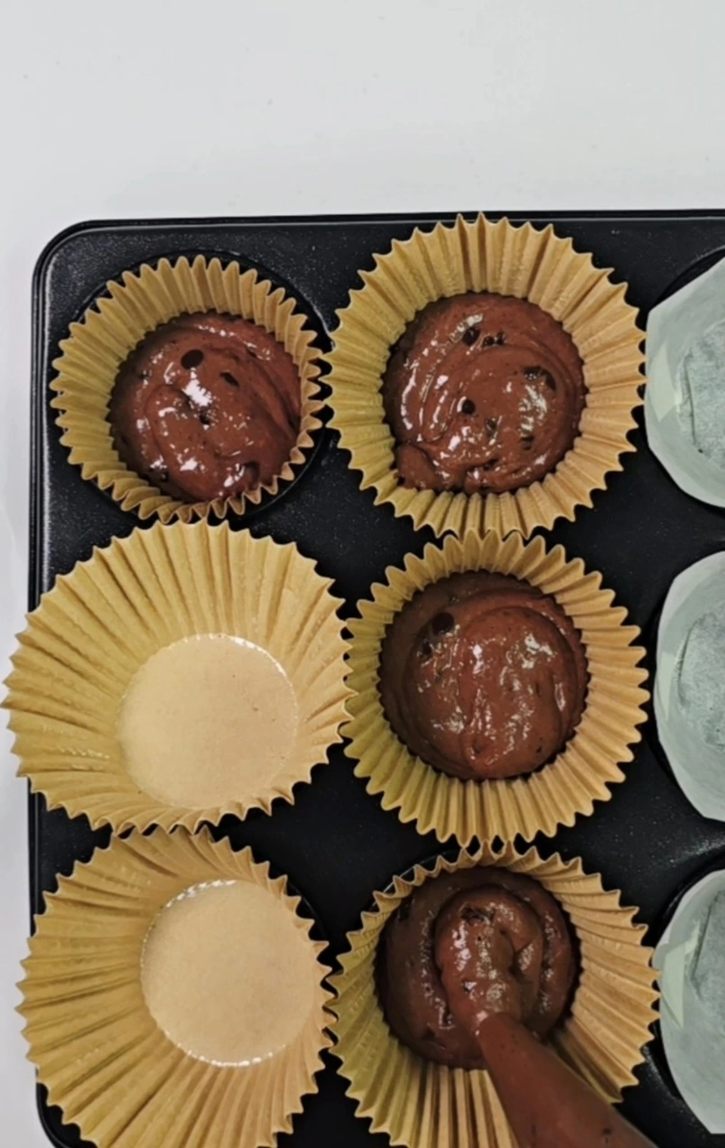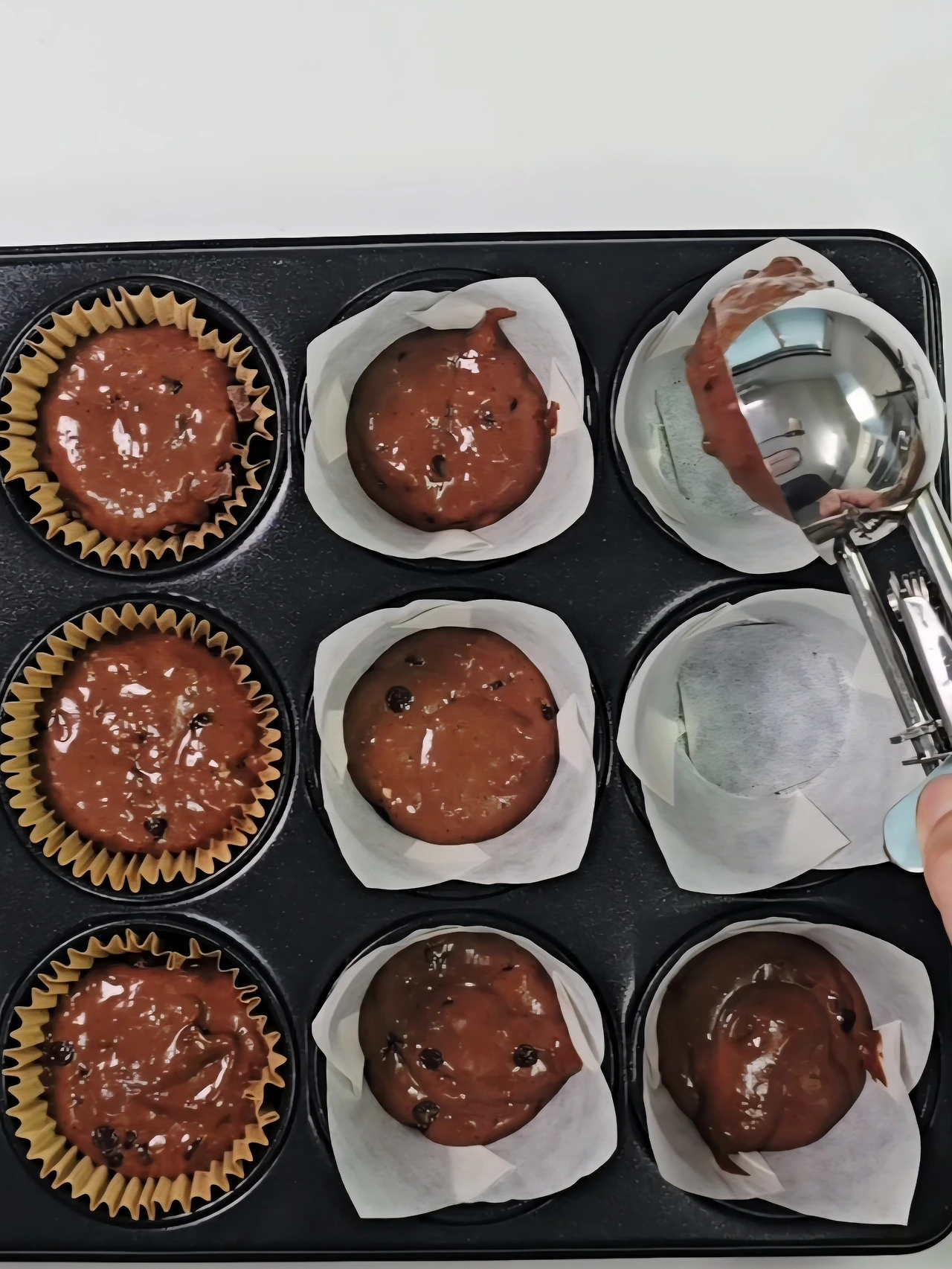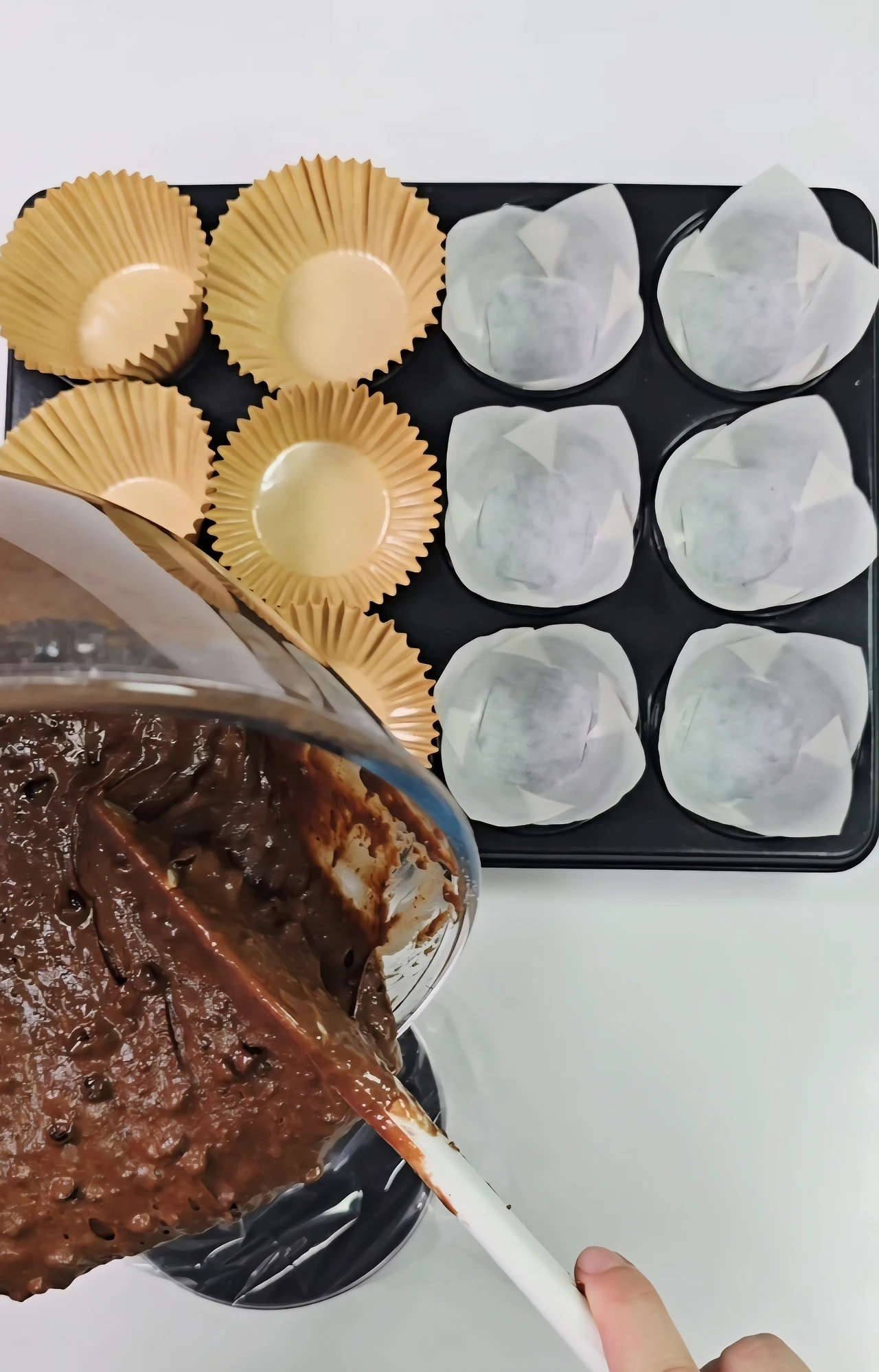 토핑용 초콜릿을 중간에 넣고, 그 뒤를 반죽으로 덮습니다.