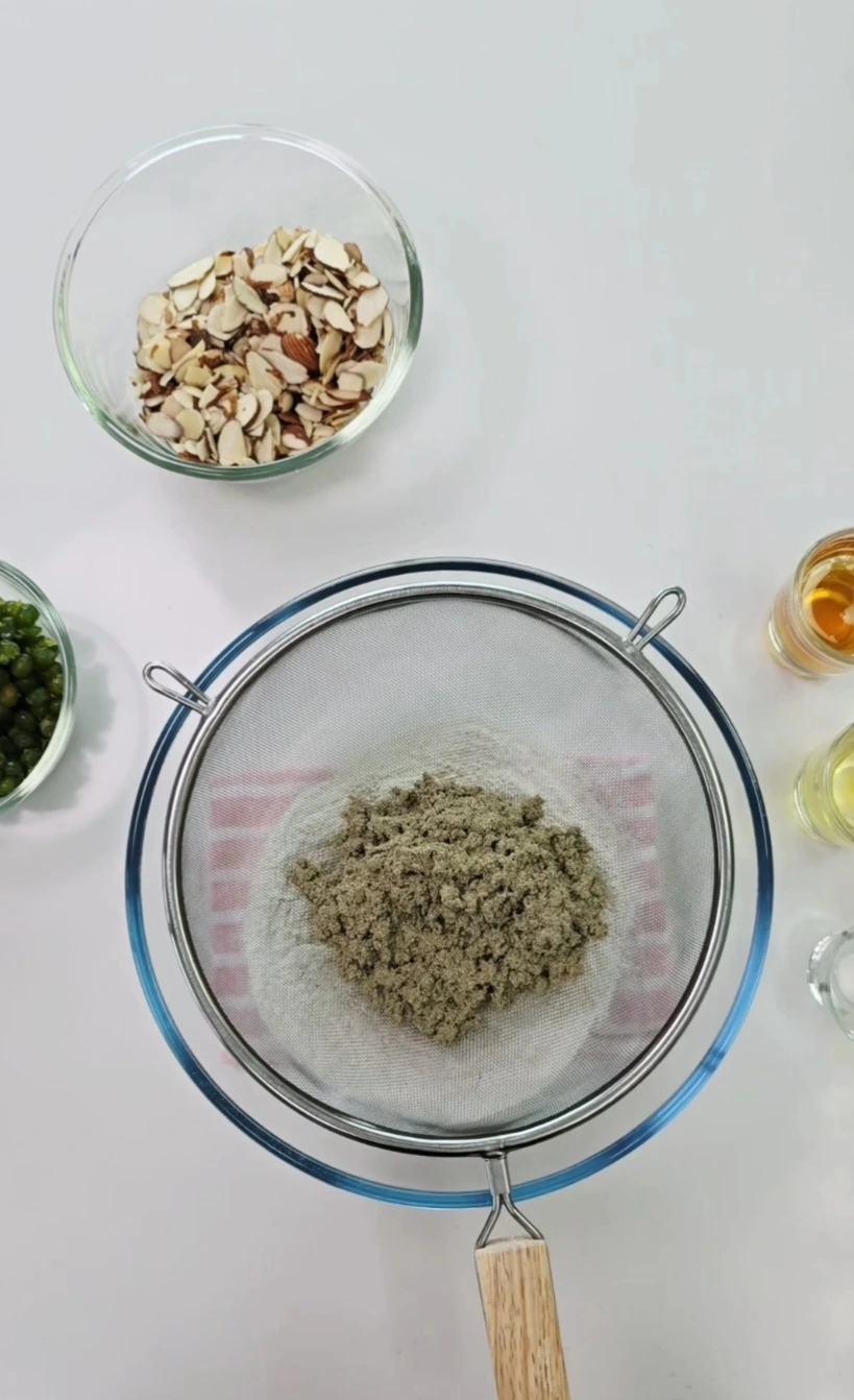 큰 볼에 찹쌀가루와 쑥가루를 넣고 체에 쳐서 곱게 내린 후 잘 섞어줍니다.