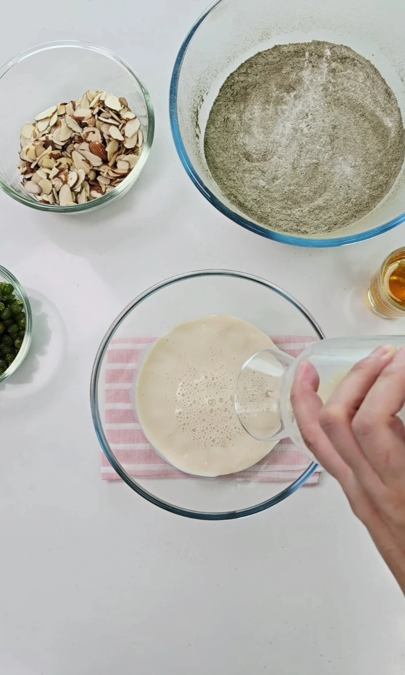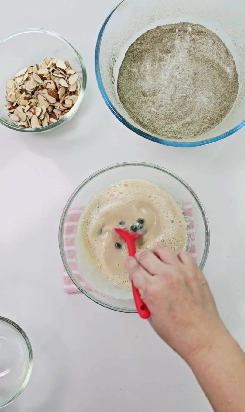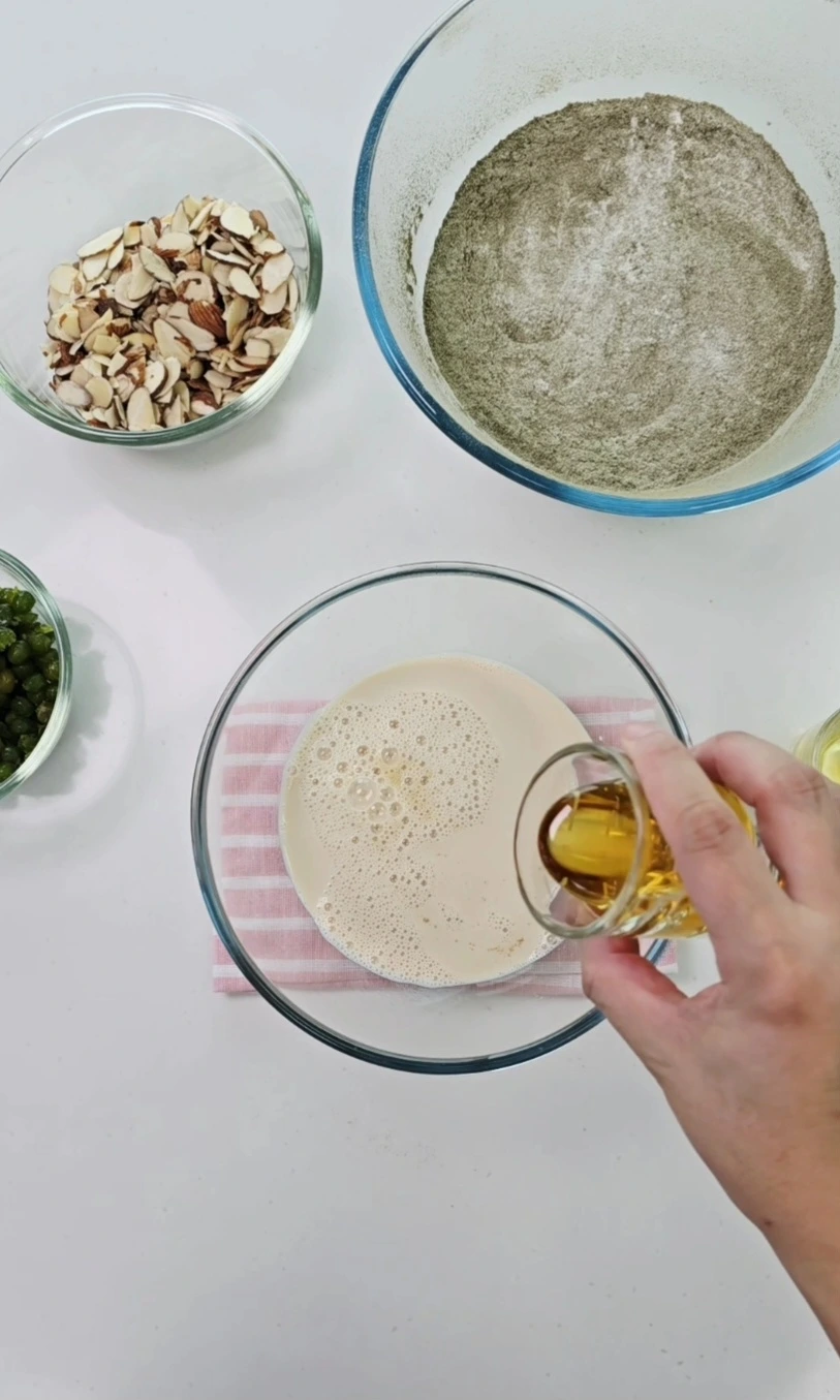 다른 볼에 유채유, 두유, 비정제 원당, 아가베시럽, 소금을 넣고 거품기로 원당이 녹을 때까지 잘 섞어줍니다.