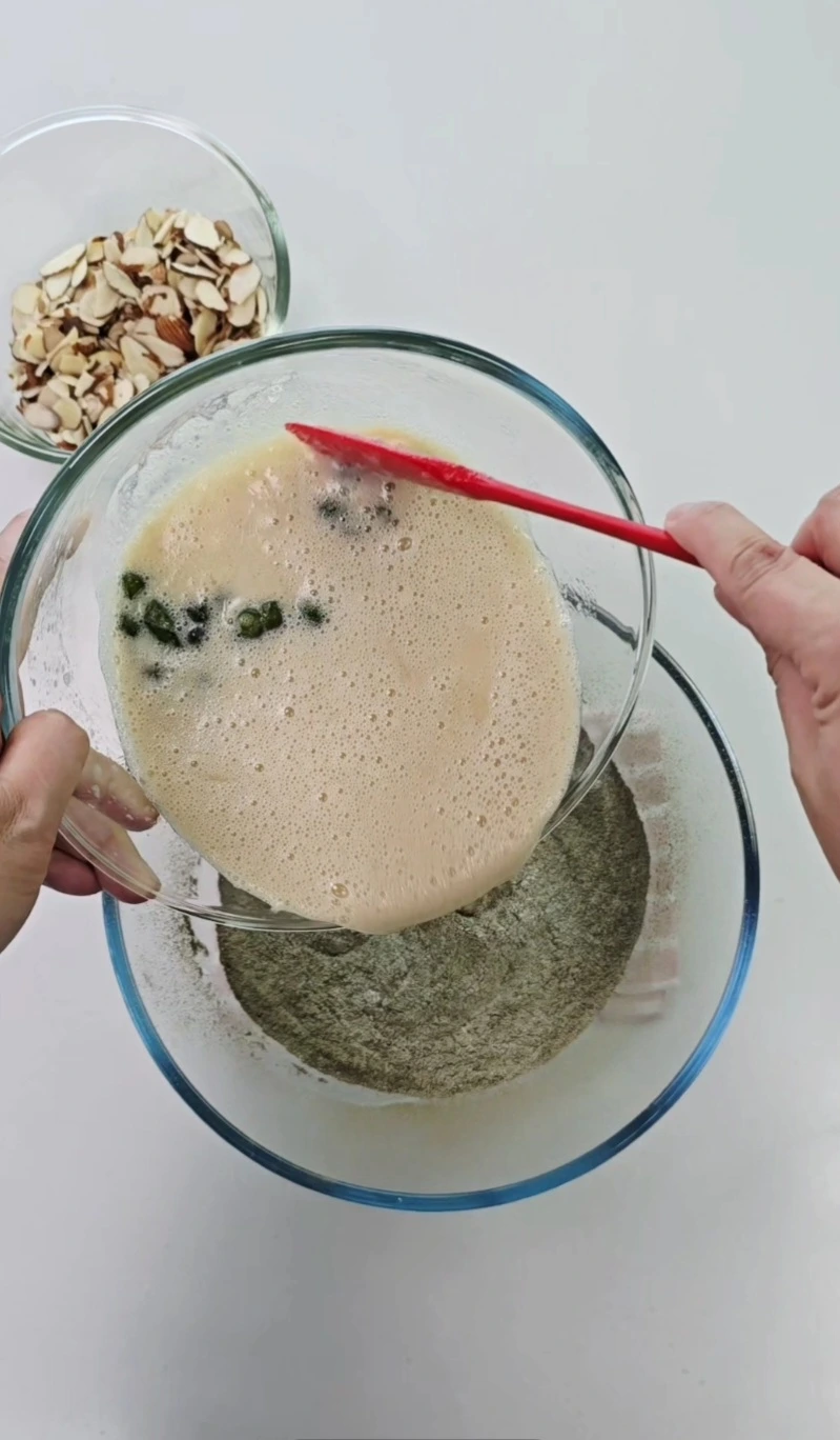 액상 재료 볼에 완두배기를 넣고 고루 섞어줍니다.