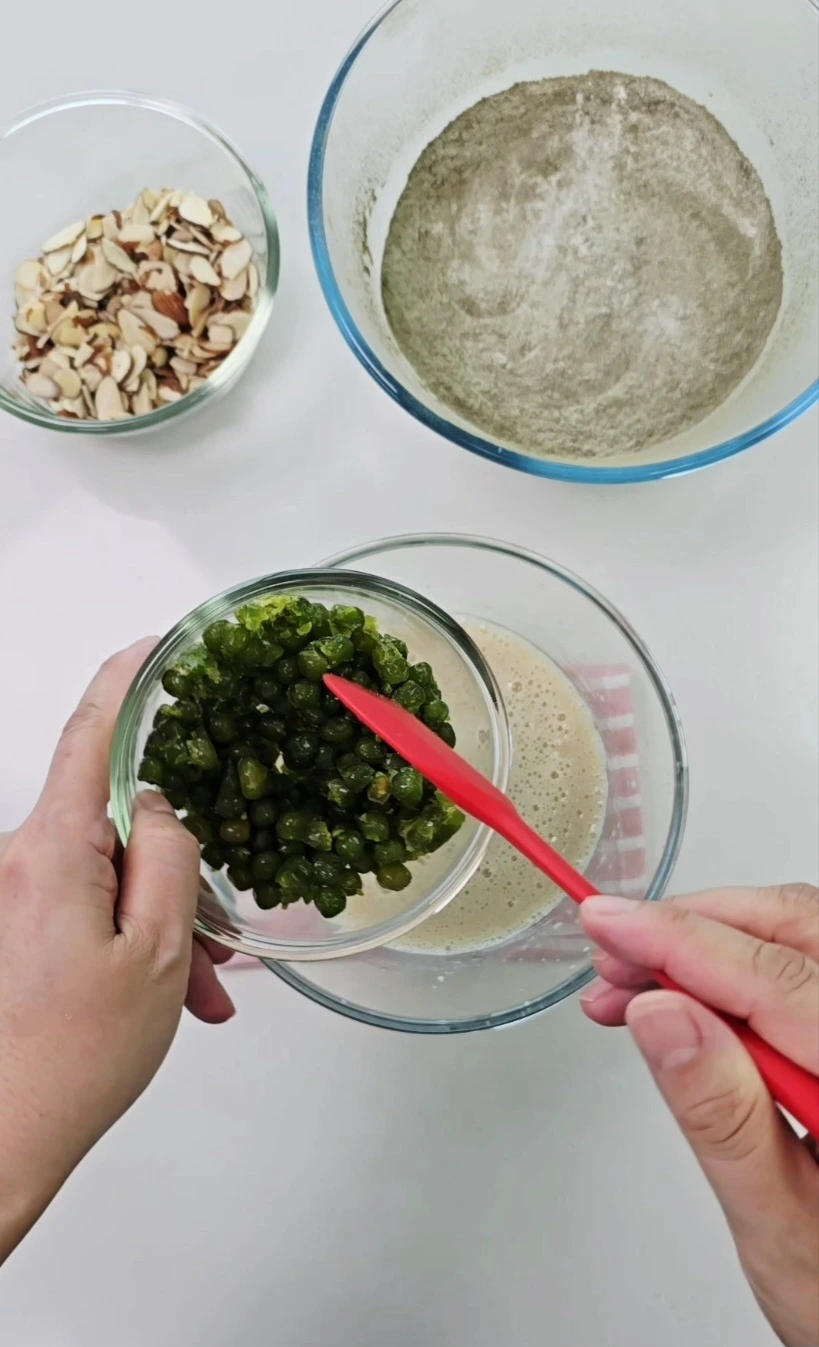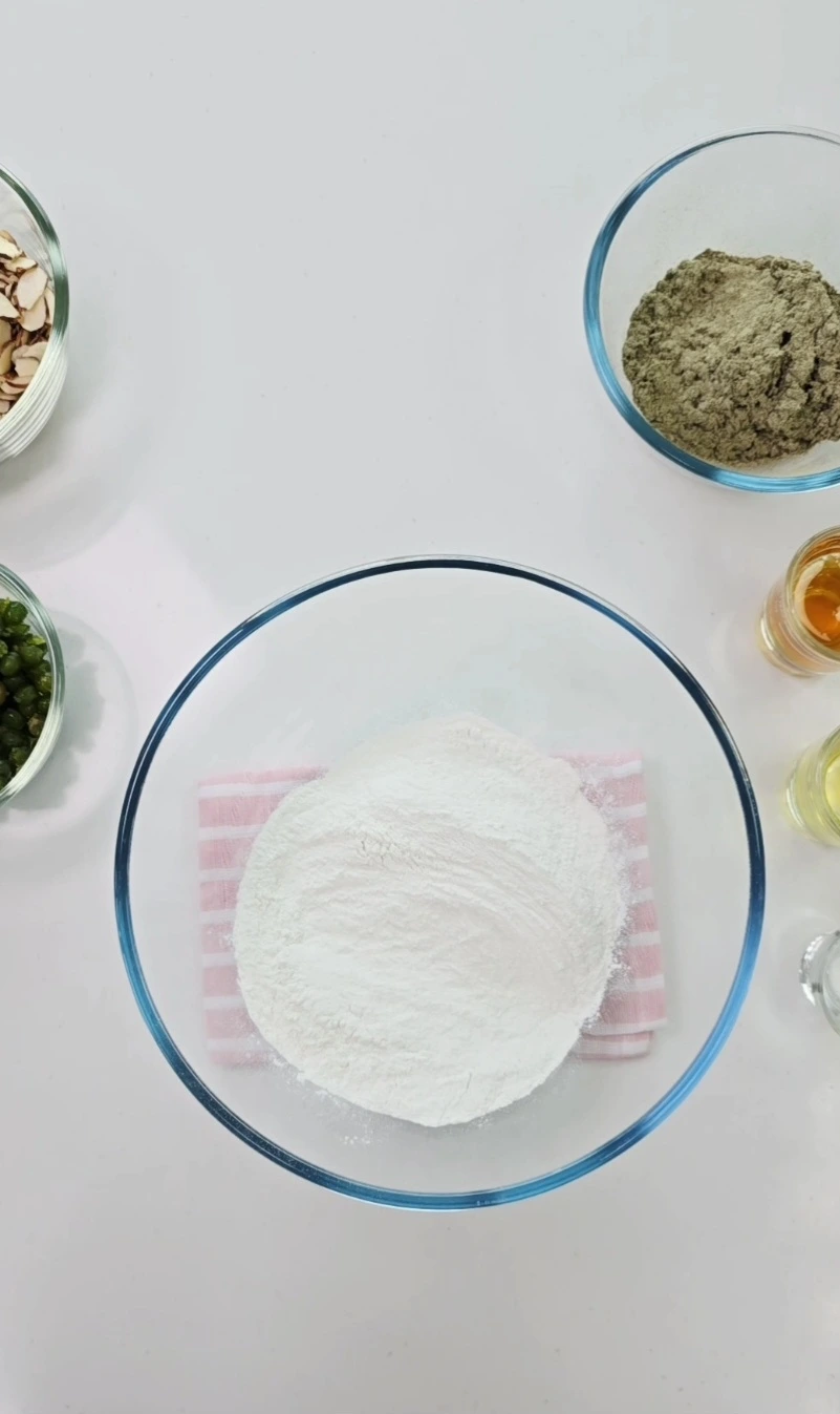 찹쌀가루의 쫀득함, 쑥가루의 향긋함, 그리고 완두배기의 달콤함과 아몬드의 고소함이 어우러져 모든 감각을 깨운다.