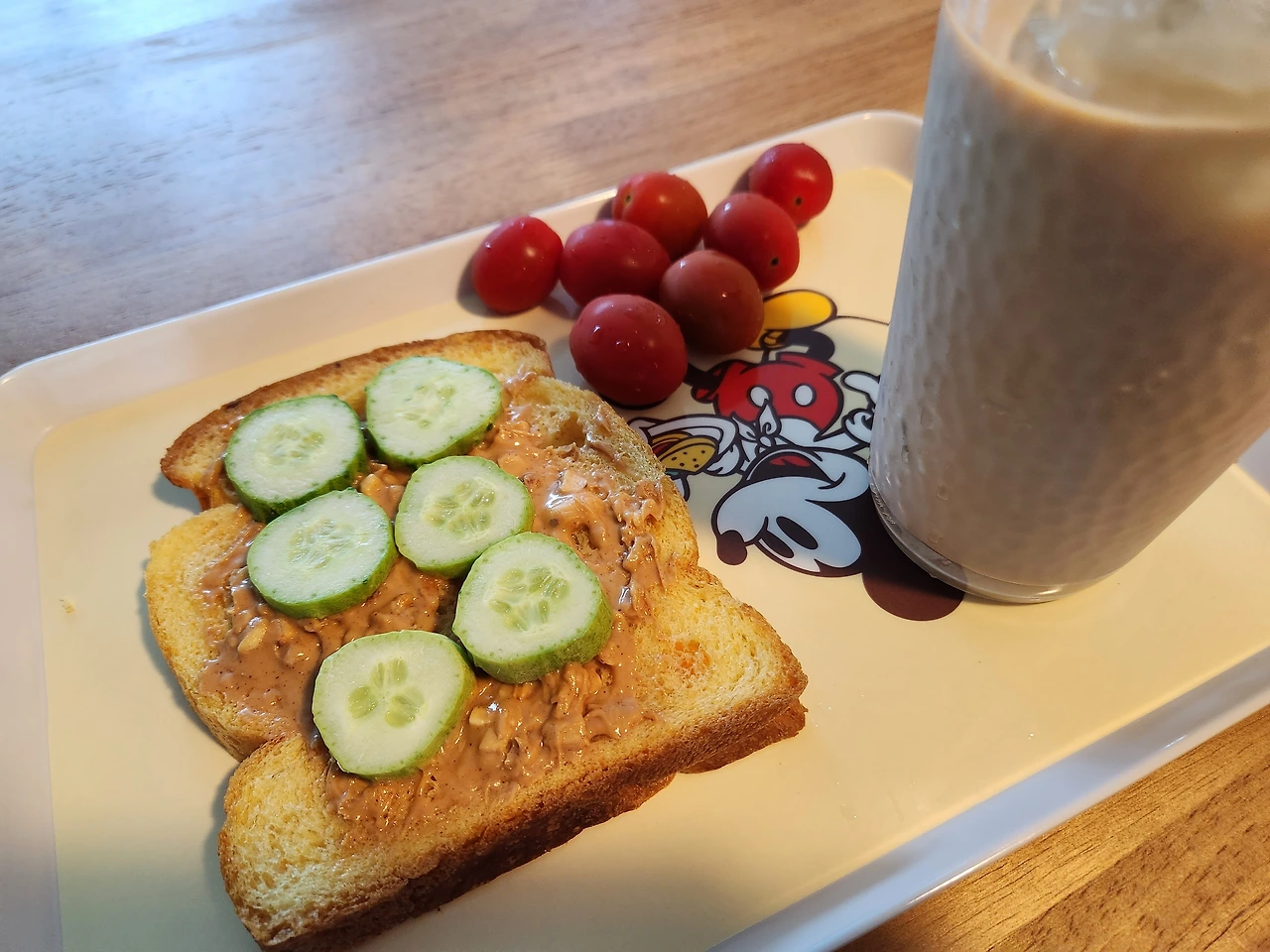 피넛버터에 오이를 얹은 단호박 식빵, 망고방울토마토, 두유커피