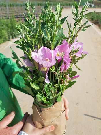 이웃이 때 맞춰 건넨 종이포대로 감싼 꽃은 금세 근사한 꽃다발이 됐다. 시골 꽃집에서만 얻을 수 있는 단 하나뿐인 꽃다발이었다. 그는 꽃 이름이 달맞이꽃이라는 설명도 함께 덧붙였다. (선물 받은 달맞이꽃은 은행나무집 화단과 이모네 집 입구에 옮겨 심어 예쁘게 자리 잡았다.)