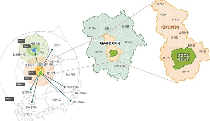 세종시 및 행복도시 위치도(출처 : 행정중심복합도시건설청)