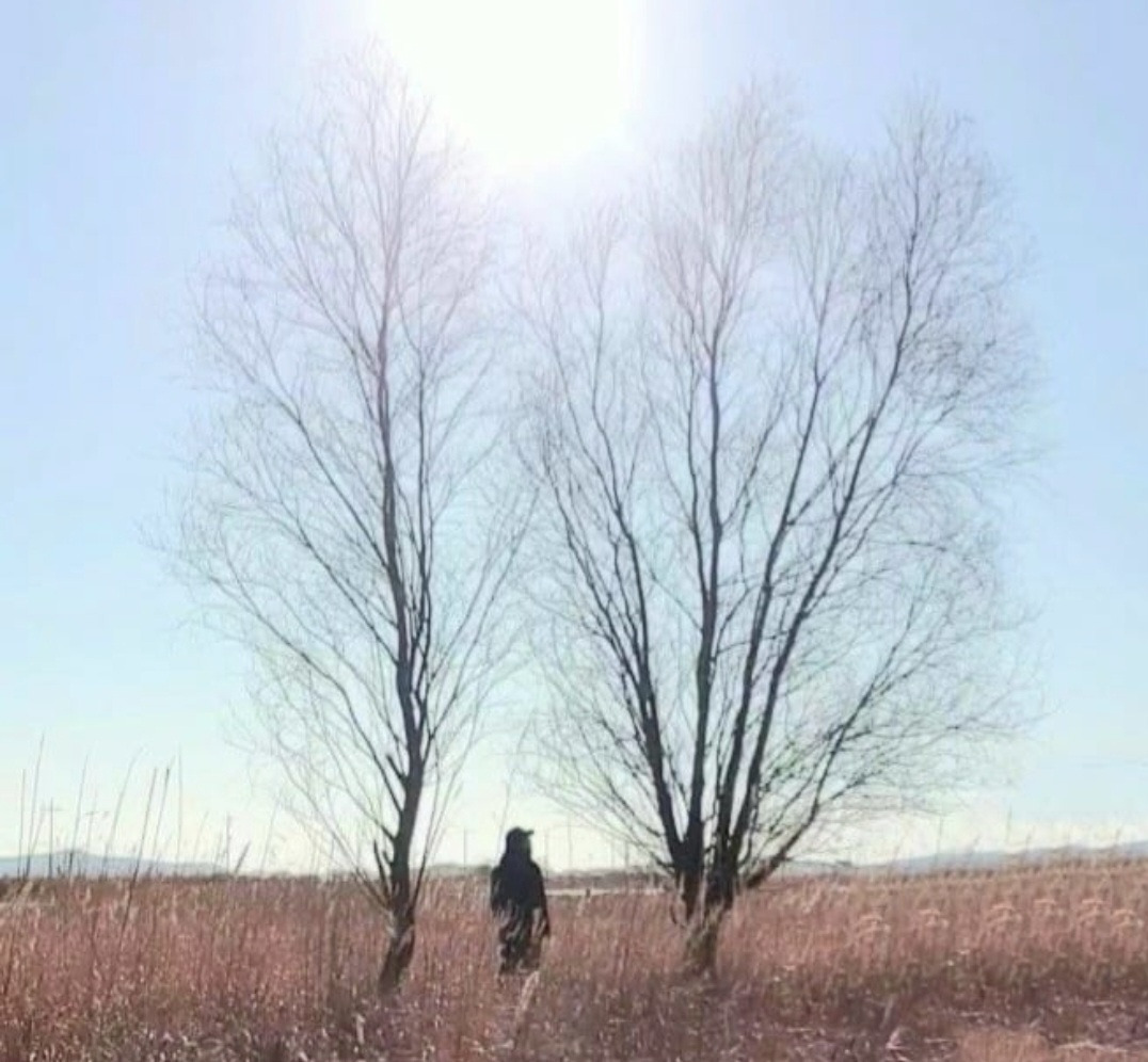 추운 겨울 앙상한 두 나무 사이에 서 있는 하루담
