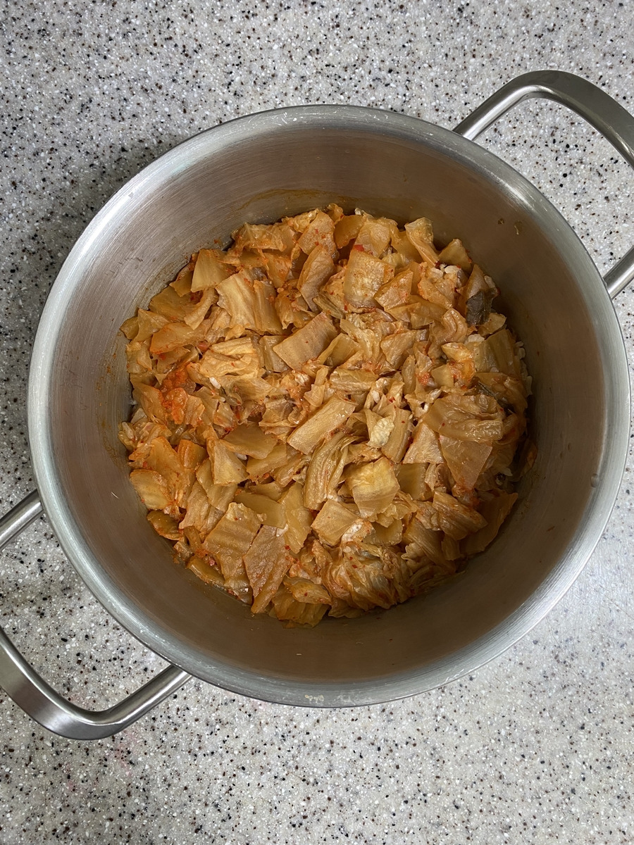 2. 가위로 대충 자른 김치와 김치 국물을 넣는다(기호에 따라 원하는 재료 추가)