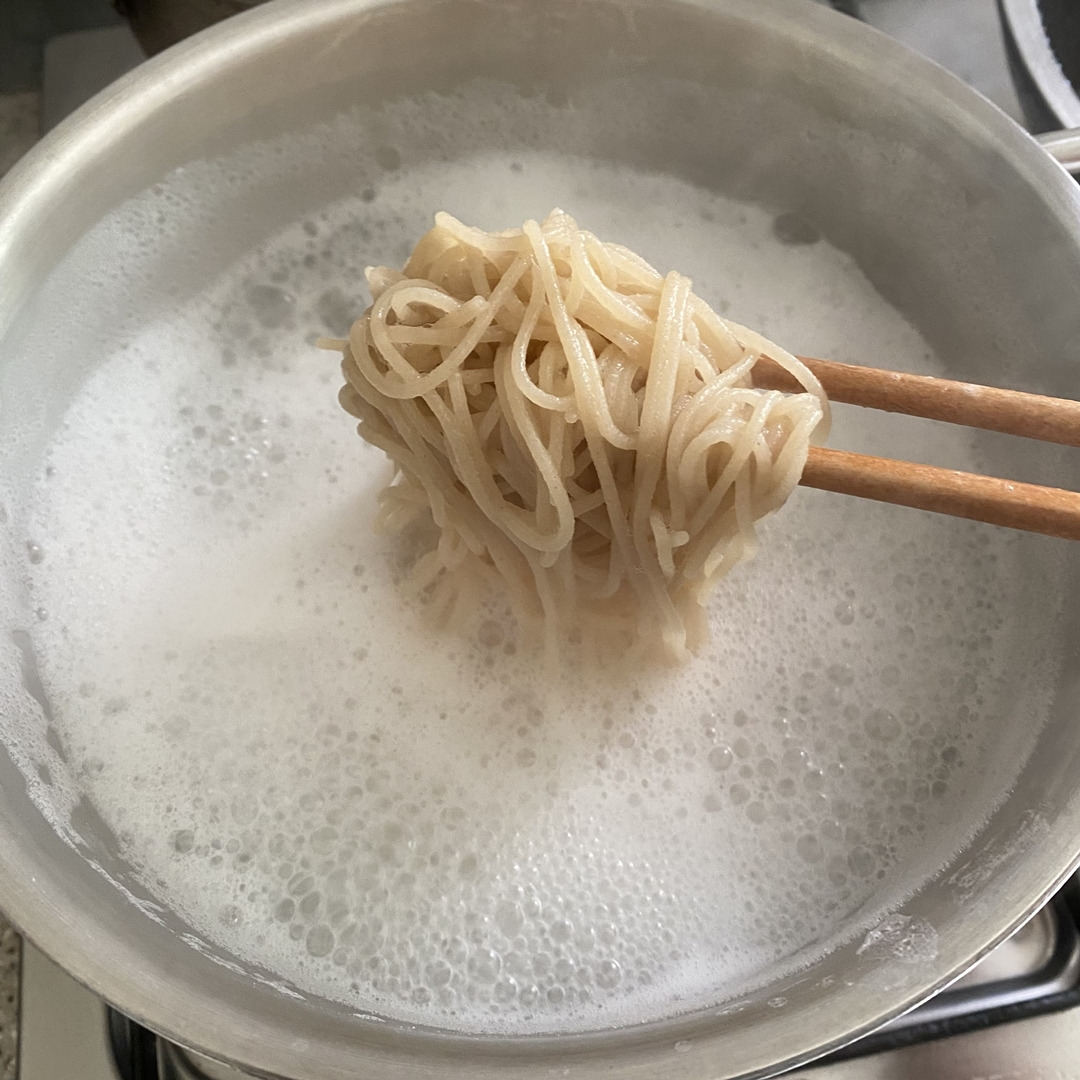 1. 끓는 물에 현미국수를 넣고 5분 삶는다.