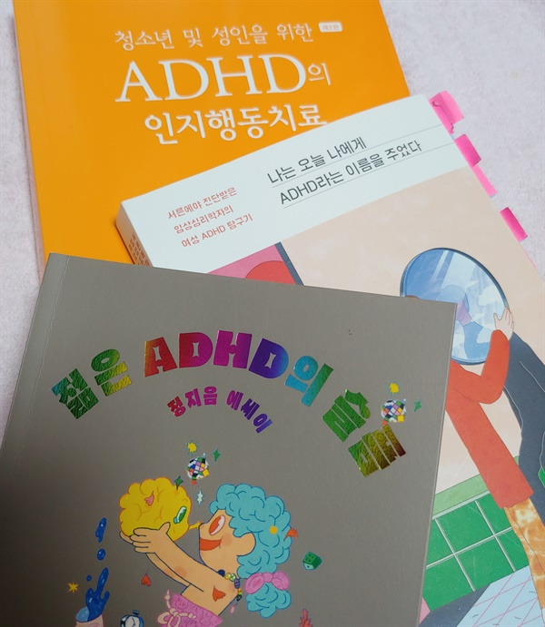 ▲ 성인 ADHD 관련 서적들 한창 힘들 때는 단 한 줄의 정보가 간절했는데, 몇 년 전부터 성인 ADHD에 대한 기사, 출판물 등이 많아져 감개무량하다. 올해는 성인 ADHD인들의 에세이가 출간되었고, ADHD 진단에서의 젠더 편향 문제를 다루는 등 논의의 폭도 넓어졌다.