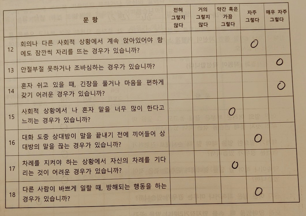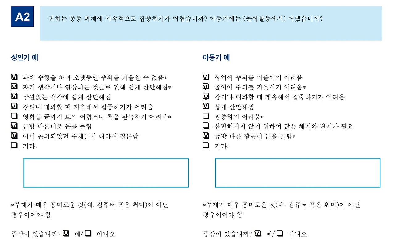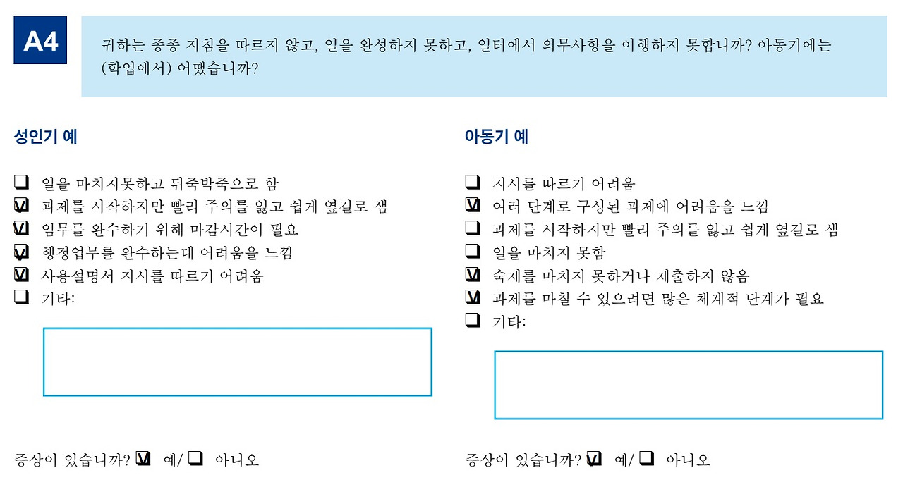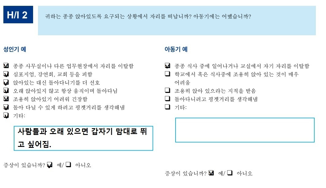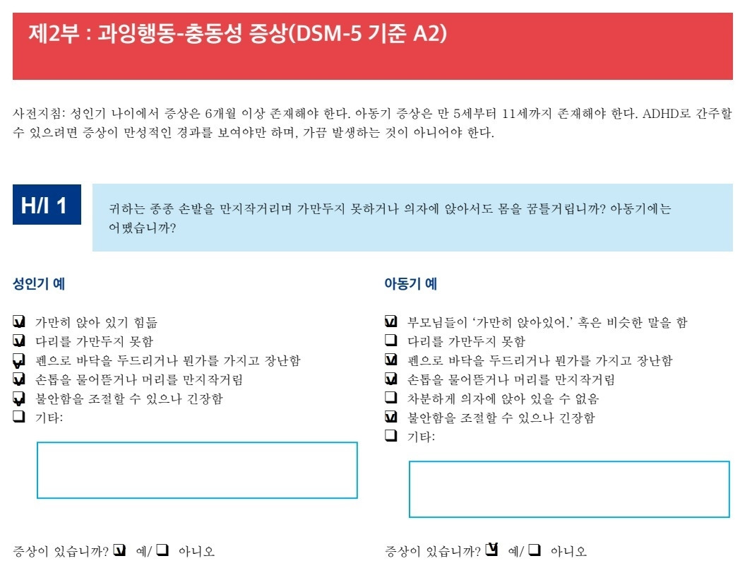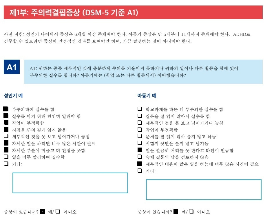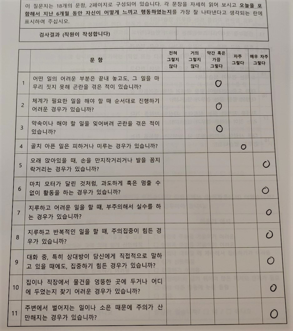 ▶주의력 결핍과 과잉행동/충동성 꼭지에서 각각 아동기에는 6개 이상, 성인기에는 5개 이상이 '예'에 해당되는 경우