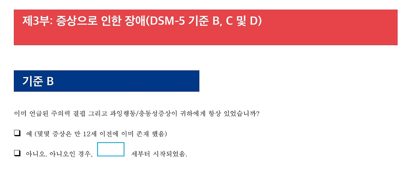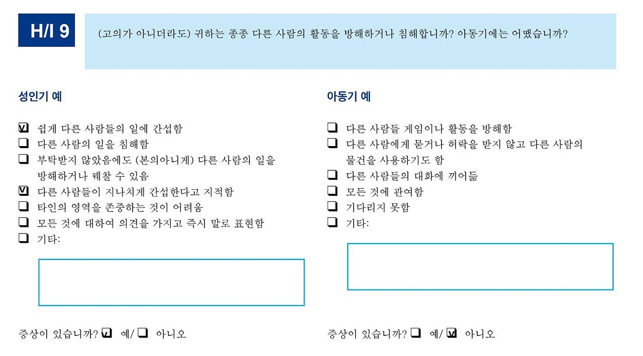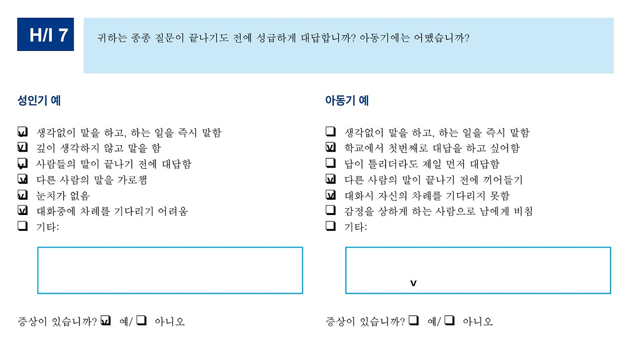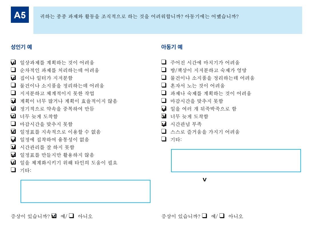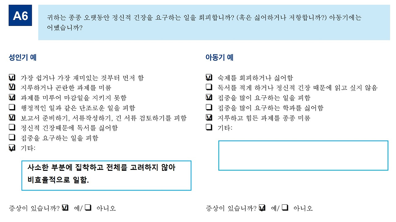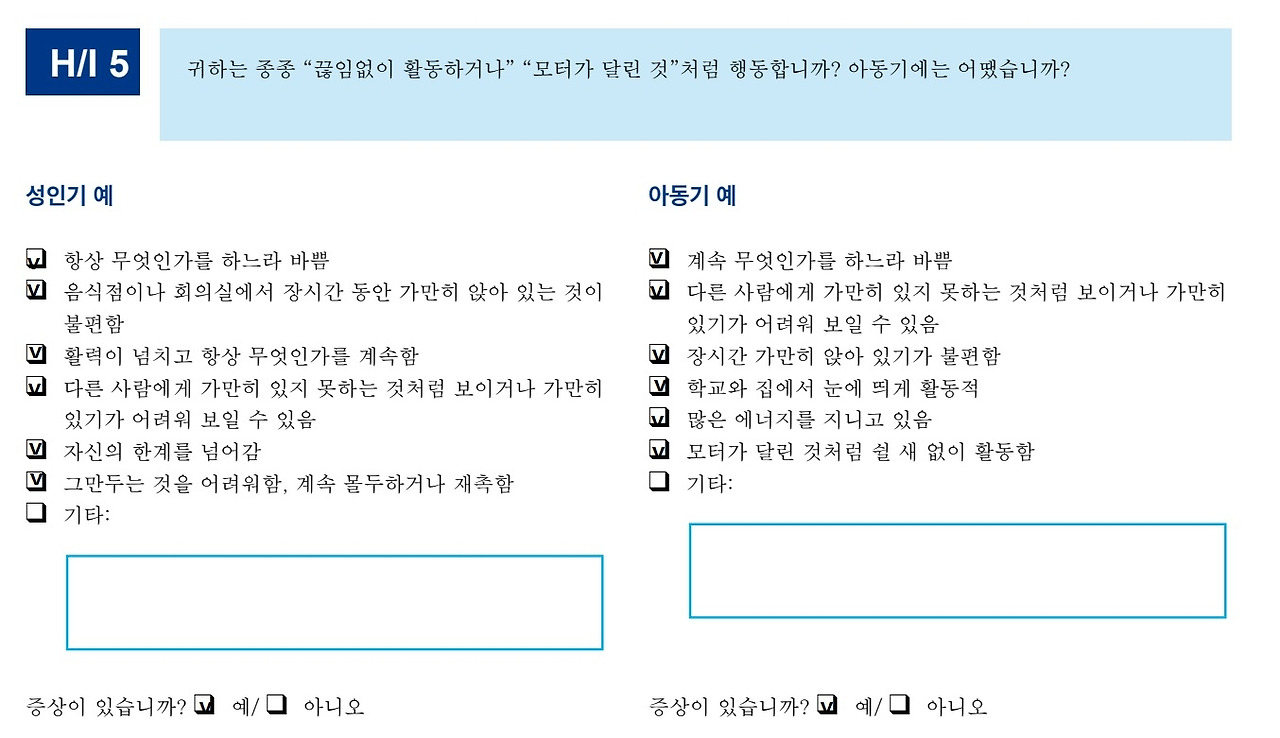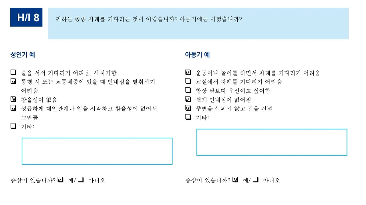 ▶주의력 결핍과 과잉행동/충동성 꼭지에서 각각 아동기에는 6개 이상, 성인기에는 5개 이상이 '예'에 해당되는 경우