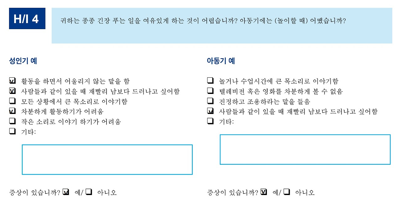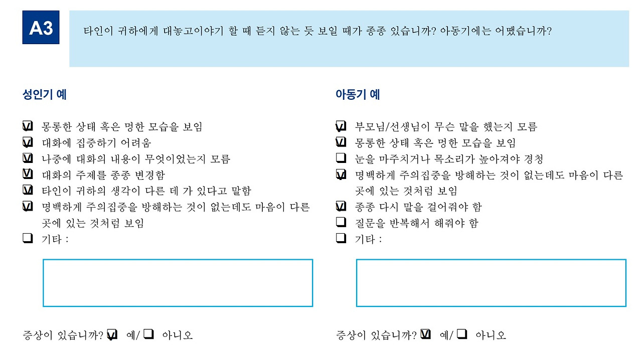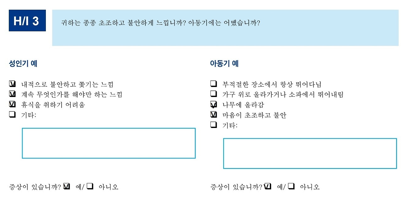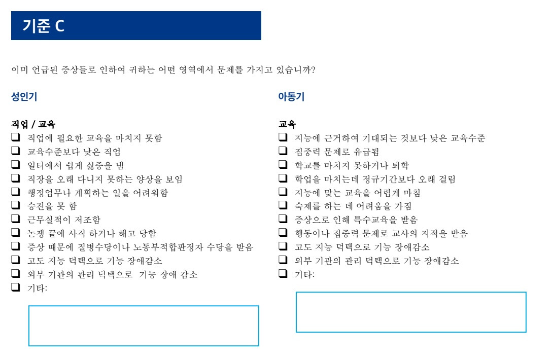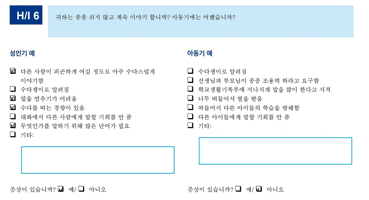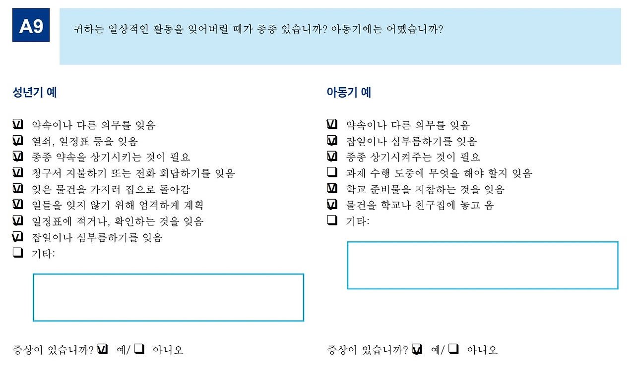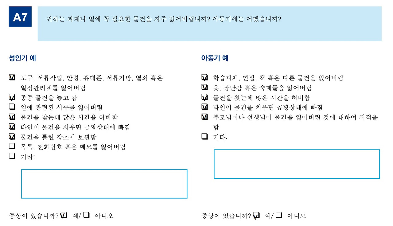 ▶주의력 결핍과 과잉행동/충동성 꼭지에서 각각 아동기에는 6개 이상, 성인기에는 5개 이상이 '예'에 해당되는 경우