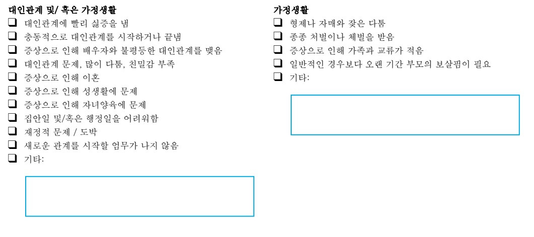 ▶두 가지 이상의 상황(직업/교육, 대인관계/가족, 사회적 교류, 여가/취미 및 자신감/자아상 분야)에서 보통 이상의 장애를 보이는 경우