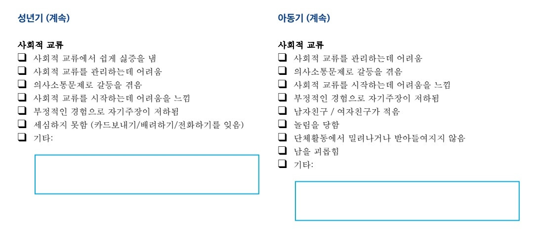 이 검사는 아동ADHD도 진단 가능하고, 성인 환자의 경우 회상이나 부수적 병력 정보 제공을 돕기 위해 배우자나 친인척이 함께 참여하는 것이 좋다고 합니다. 특히 아동기 증세는 가족들이 알려주면 도움이 되니까요. 여기서 아동기는 만 5세~11세를 말합니다. 저는 기억이 자세히 나지 않아서 이번에 초등학교 1-6학년 때 쓴 일기를 모두 읽고 작성해 봤는데, 그래도 기억이 안 나는 건 '아니오'로 표시했습니다.