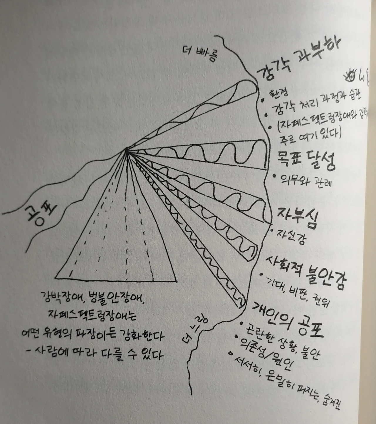나는 공포가 나를 덮쳐오는 것을 느낄 때, 상황을 파악하고 완전한 멜트다운을 피하려고 프리즘 효과를 이용했다. 누군가가 나를 스치고 지나가거나, 큰 소리로 외치거나, 높은 톤으로 낄낄거리는 것처럼, 현재 내 주변에서 일어나는 감각적 촉발 요인, 즉 진동수가 높은 파동인가? 아니면 미래 혹은 질병에 대한 공포나 내게 건선을 가져다줄 가려운 점퍼처럼 나를 지배하는 낮은 진동수의 지속적인 생각인가? (118쪽)