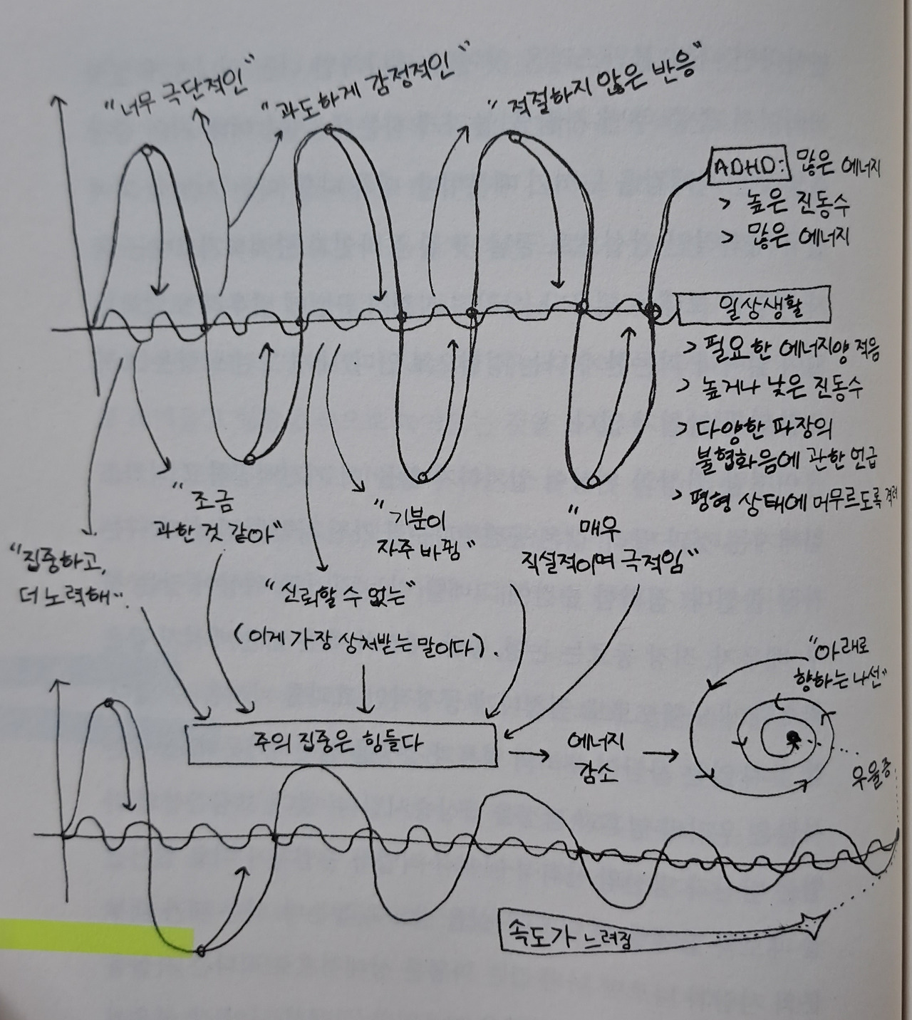 이와 반대로 진폭이 큰 사람은 연소할 에너지가 더 많은 사람이다. 감정의 마루와 골이 더 극단적이고 아마 움직임도 더 빠를 것이다. 즉 더 높은 진동수를 갖는다. 그네로 비유하자면 높이 솟아올랐다가 불안정하게 하강하며 혹은 예상치 못하게 갑작스러운 힘이 요동치면서 당신을 멀미 나게 할 수도 있다. 지금 내가 묘사한 것은 당연히 나 자신이며, 특히 내 ADHD 특성이 그렇다. (136-137쪽)