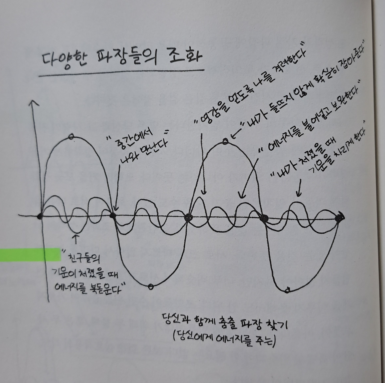 특히 진폭이 크고 극적인 사람과 함께할 때 제가 덩달아 제 진폭의 최대치를 보이도록 놔두면 파장이 증폭되어 관계 갈등이 극심해지기 때문에, 자신의 감정 폭을 좁히고 상대방의 변곡점이 어디일지 지켜봐야 한다는 점도 이 챕터의 그래프를 보면서 또렷하게 떠올릴 수 있었습니다.