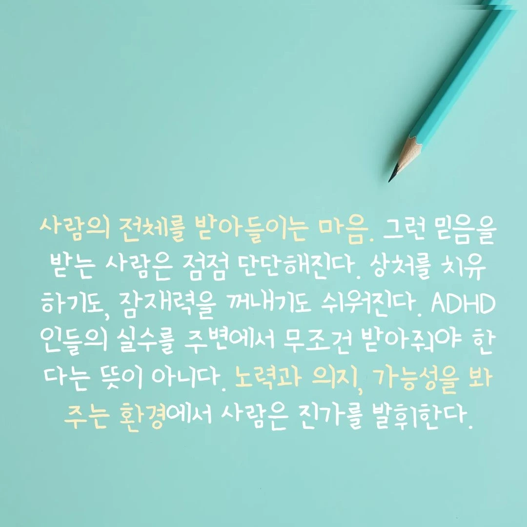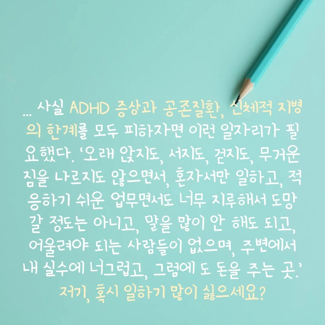 제게 안 맞는 일이 어떤 ADHD인에게는 잘 맞을 수도 있고, 또 제게 맞는 일이 누군가에겐 안 맞을 수도 있지요.